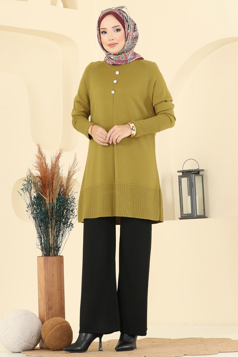 Smart and stylish, the Buttoned Knitwear Set with Accessories is designed to warm your autumn and winter. Offering ease of washing at 30 degrees with a delicate wash feature, this hijab-friendly product combines comfort and elegance. Made from knit fabric, the set consists of a bicycle neck tunic and an elastic waist pants. Complete your style with buttons added as accessories.