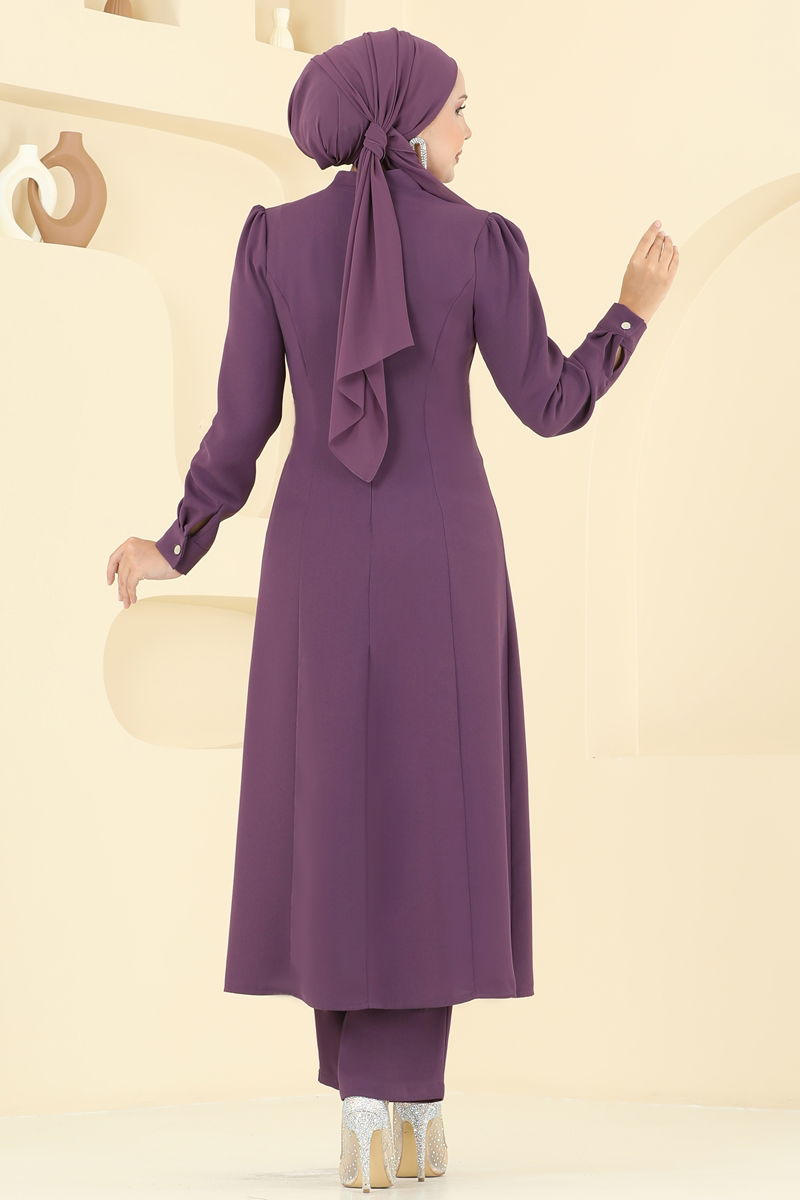 Product Feature : It is a new season hijab fashion product. The product has a Half Judge collar. It has a slash.. Unlined. The product has a zipper at the from the back part. The stones are glued. The waist of the trousers is elastic. Cuff buttons are active. There may be a tonal difference in the product due to concept photo shoots.