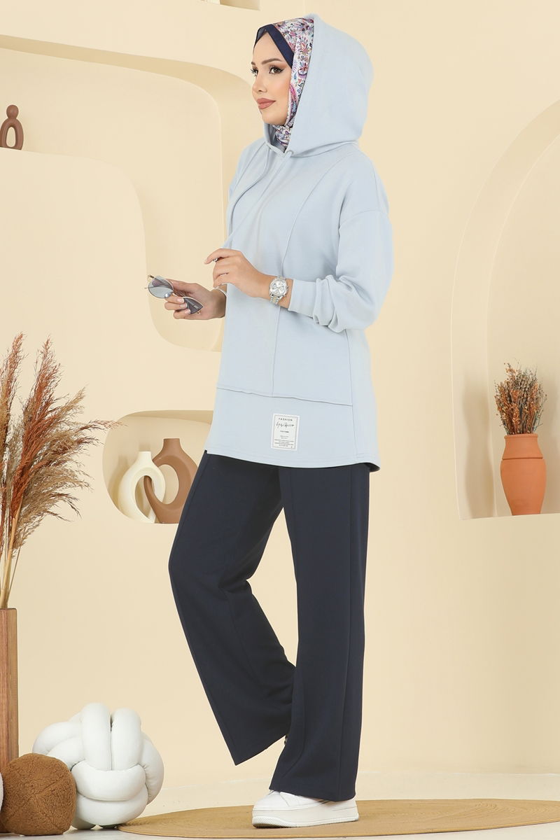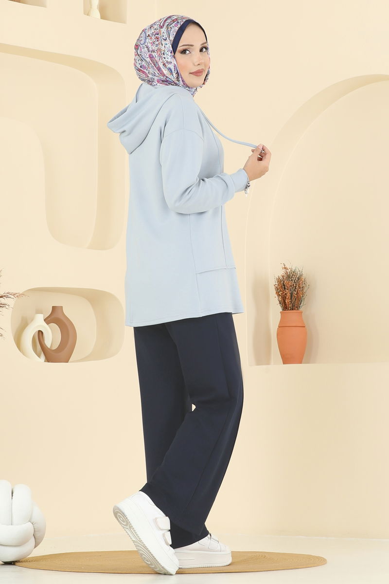 The Hooded Detail Modal Suit COMBINE is a modest wear suitable for all seasons. Made from modal fabric, it features a hooded neckline and is unlined. The model displayed wears a size 38. It requires gentle washing at up to 30 degrees Celsius. The trousers have an elastic waist, ensuring comfort in both the tunic and trousers.