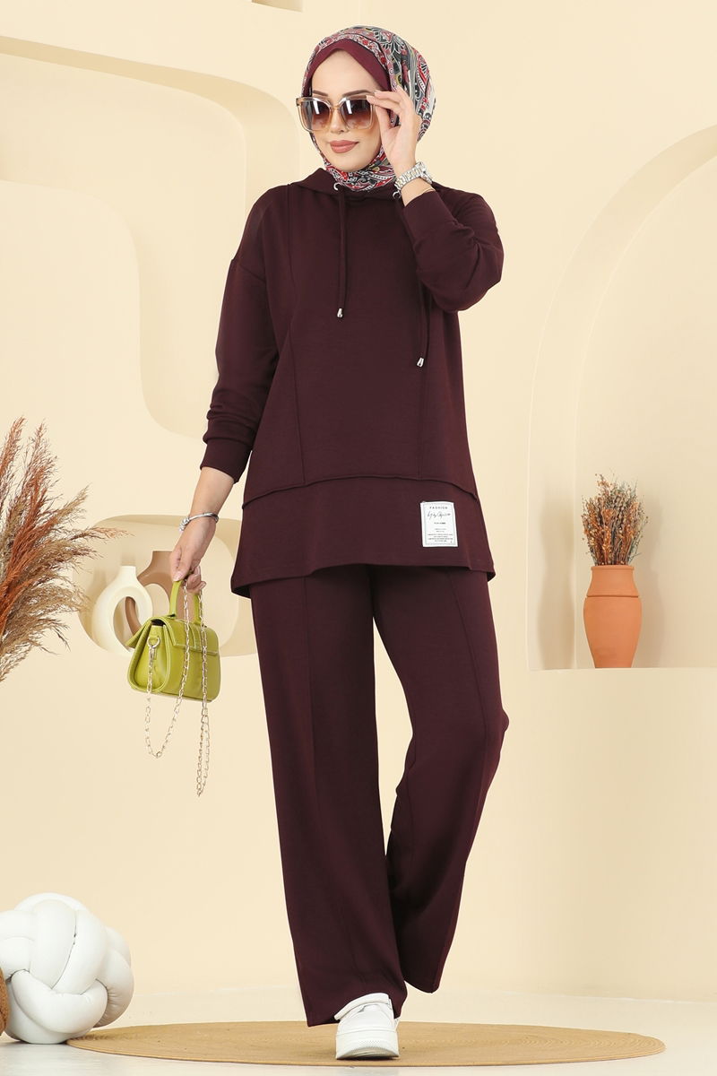 The Hooded Detail Modal Suit COMBINE is a modest wear suitable for all seasons. Made from modal fabric, it features a hooded neckline and is unlined. The model displayed wears a size 38. It requires gentle washing at up to 30 degrees Celsius. The trousers have an elastic waist, ensuring comfort in both the tunic and trousers.