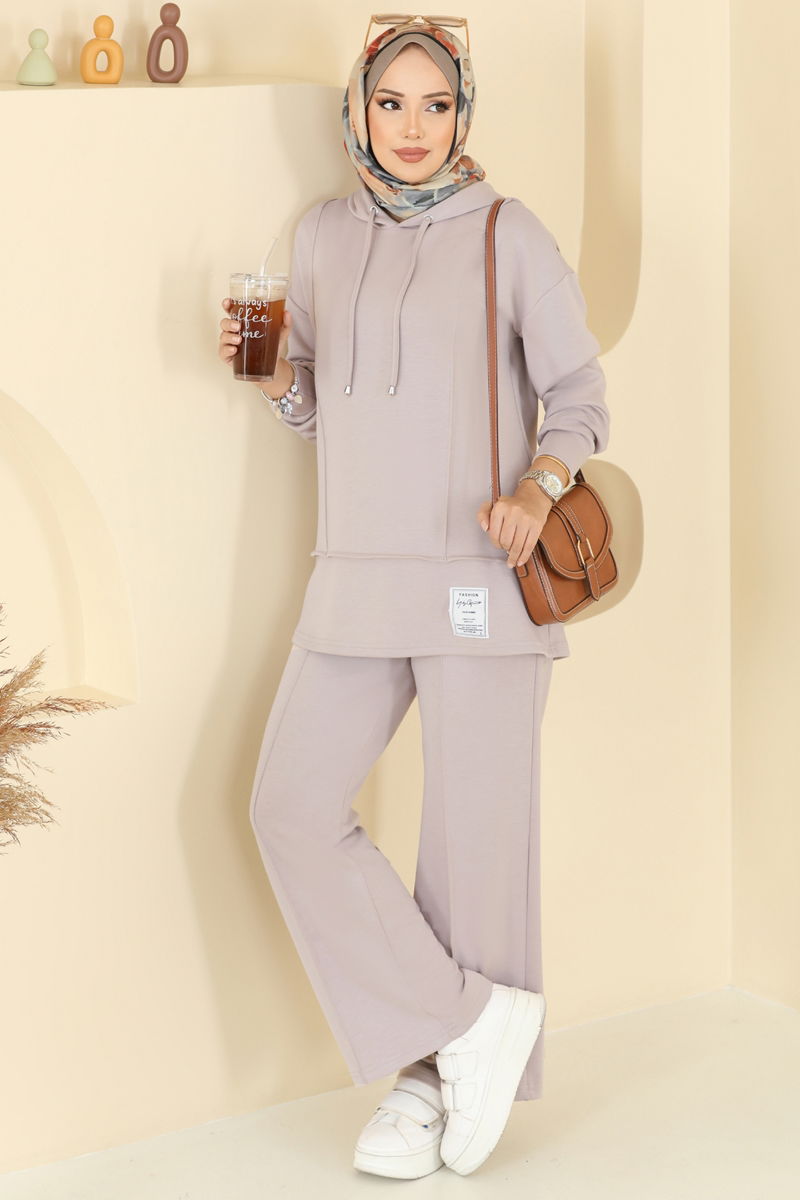 The Hooded Detail Modal Suit COMBINE is a modest wear suitable for all seasons. Made from modal fabric, it features a hooded neckline and is unlined. The model displayed wears a size 38. It requires gentle washing at up to 30 degrees Celsius. The trousers have an elastic waist, ensuring comfort in both the tunic and trousers.
