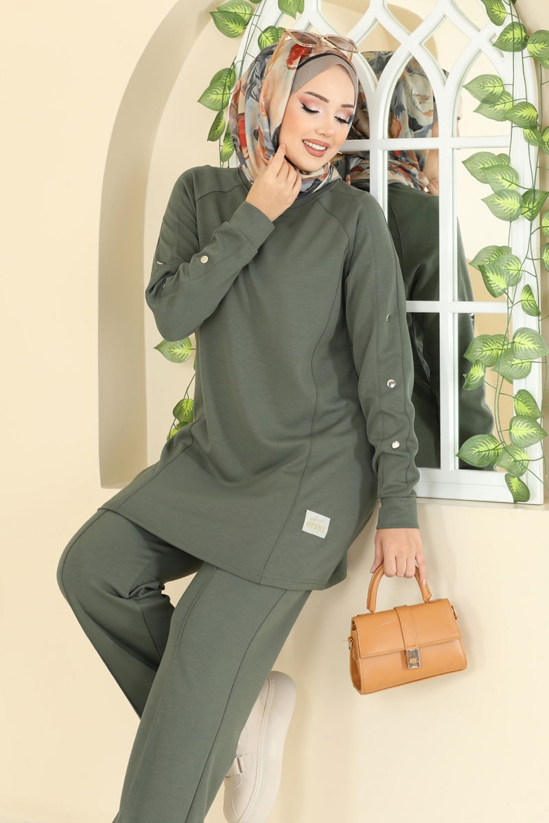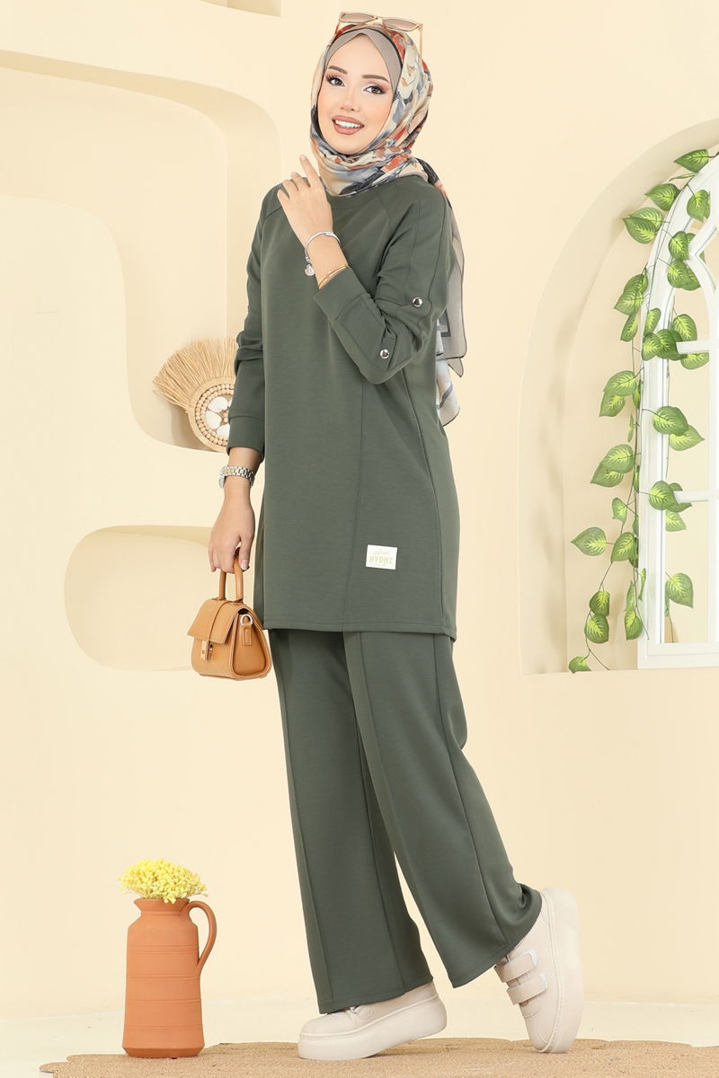 Discover the Cufflink Detailed Modal Suit, COMBINE model, a special design hijab product that offers comfort and elegance together in all four seasons. This suit, which can be washed at 30 degrees due to its delicate structure, is made of modal fabric. It prioritizes comfort with its bicycle neck style and lining-free structure. It enhances visual integrity with chic buttons and sewn arm detail. The elastic waist of the trousers ensures maximum comfort. Comprising a tunic and trousers, stand out in any setting with your stylish appearance.