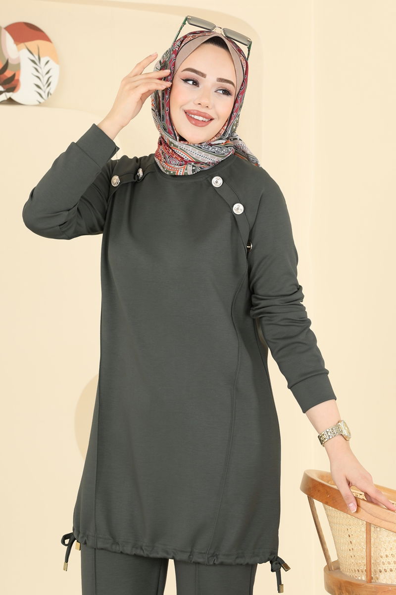 The Accessorized Buttoned Modal Suit is a hijab fashion item suitable for all seasons. It can be washed at 30 degrees without spinning due to its delicate fabric. Made from modal fabric, this outfit features a crew neck design and is unlined. The buttons are purely decorative, adding a stylish touch, while the pants have an elastic waist for comfort. Perfect for a chic and modern look!