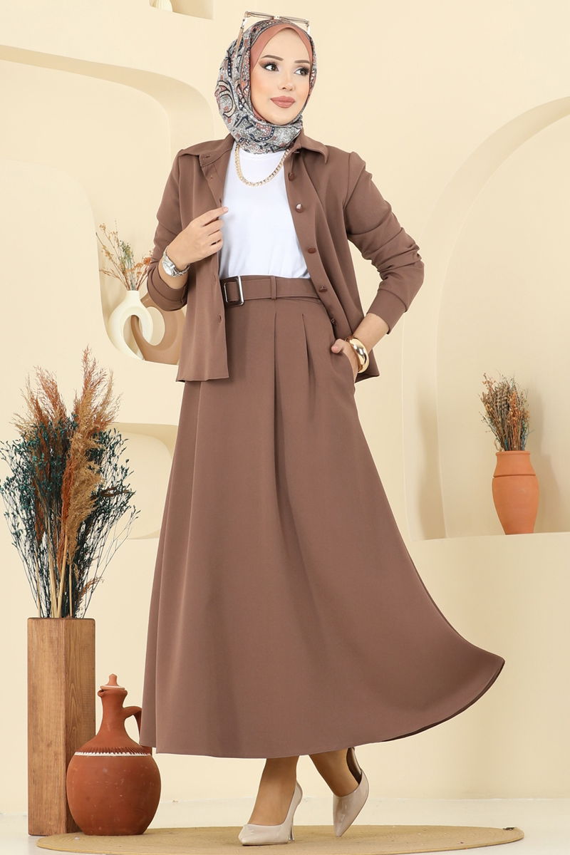 The Belted Skirt Suit COMBINE model is a chic option specially designed for modest fashion. Suitable for gentle wash at 30 degrees, this product is made from durable Dabıl fabric. It offers a practical use with its shirt collar and front button design. The unlined structure provides a lightweight feel, while the stitched belt detail adds a modern look. The belt is removable and can be adjusted to your style. The zipper on the skirt part offers a comfortable wear, while pockets in both the shirt and skirt add functionality.