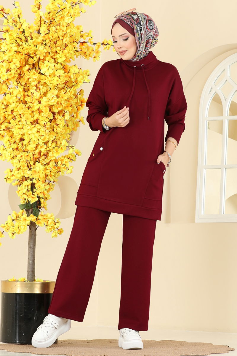 The Pocket Detail Lace-up Suit COMBINATION is a stylish hijab outfit suitable for all seasons. Made from modal fabric, this product can be gently washed at 30 degrees Celsius. Consisting of a tunic and trousers, the suit features an elastic waist on the trousers and practical pockets on both pieces. With a semi-high collar and unlined, this combination appears in size S on the model. The laces at the collar are adjustable, allowing customization to your personal taste.