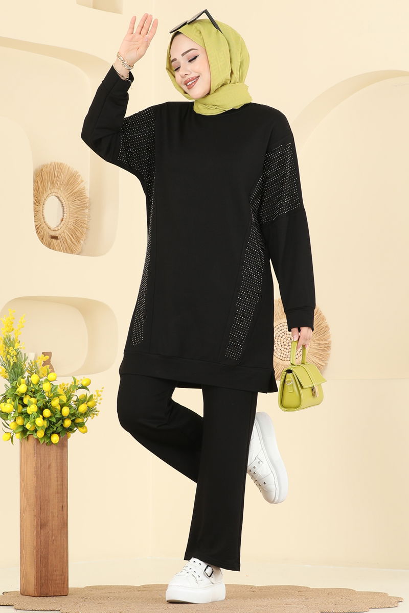 Embrace elegance and comfort in your modest wardrobe with the Stone Detailed Double Thread Set COMBINATION, suitable for all seasons. This special design can be easily cleaned with a gentle wash, and is made from double thread and crystal fabric. Featuring a crew neck design, this outfit provides a modern look. The liner-free structure and elastic waist of the trousers ensure comfort all day long. The set, consisting of a tunic and trousers, is adorned with stick-on stones. The sample on the model is size 38.