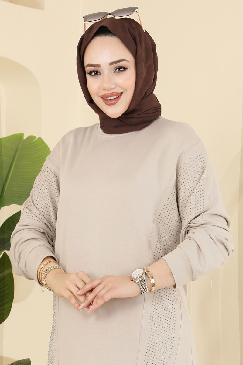 Embrace elegance and comfort in your modest wardrobe with the Stone Detailed Double Thread Set COMBINATION, suitable for all seasons. This special design can be easily cleaned with a gentle wash, and is made from double thread and crystal fabric. Featuring a crew neck design, this outfit provides a modern look. The liner-free structure and elastic waist of the trousers ensure comfort all day long. The set, consisting of a tunic and trousers, is adorned with stick-on stones. The sample on the model is size 38.