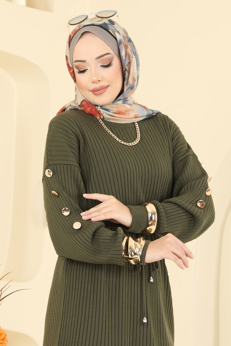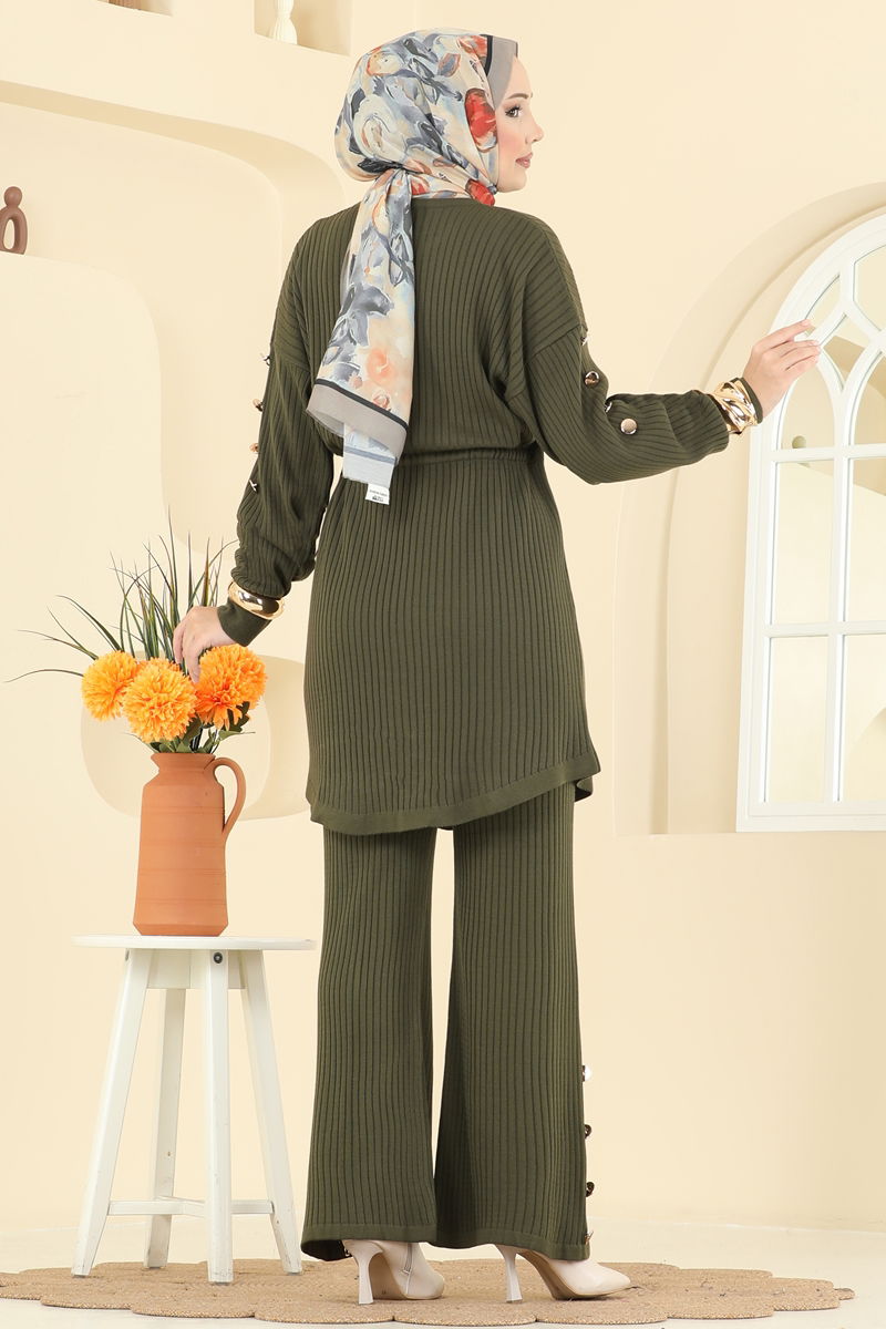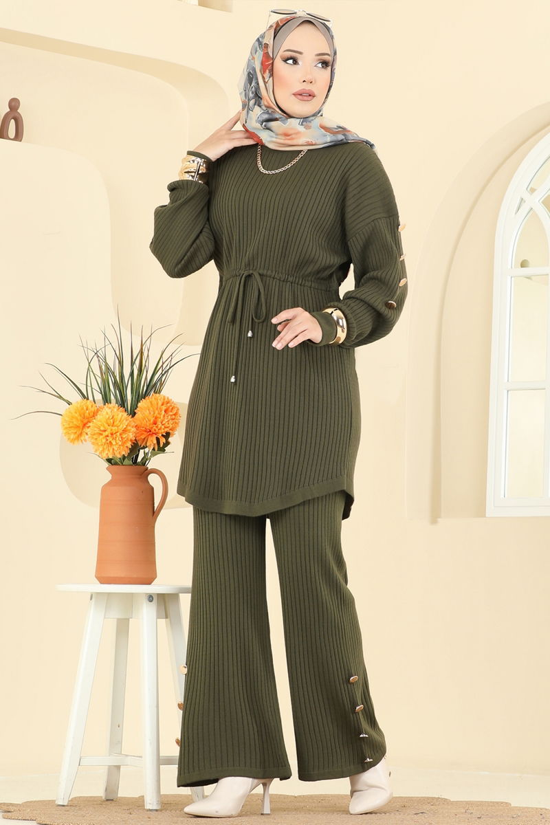 The Drawstring Waist Knit Suit, with its KOMBIN model, introduces a new style in modest fashion. Ideal for autumn and winter, this product offers ease of use with its gentle wash at 30 degrees option. The knit fabric keeps you warm while the crew neck marries elegance with comfort. The drawstring waist design and elastic pant waist provide a perfect fit. Offered as a set with a tunic and pants, this product caters to a broad audience with sizes ranging from 36-38-40-42.