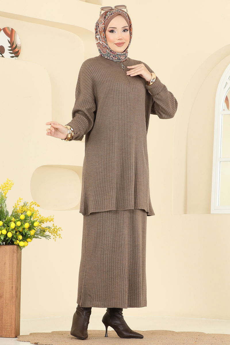 Designed for the autumn and winter months, the Half-Zip Skirt Set breathes new life into modest fashion. This chic and comfortable outfit stands out with the warm properties of its knitted fabric. Its straight collar design and unlined structure offer comfortable wear, while the front half-zip adds practicality. The elastic waist skirt ensures a comfortable experience throughout the day. Easily washable at 30 degrees on a gentle cycle, this product is available from sizes 36 to 42. Stay warm and stylish during the winter months!