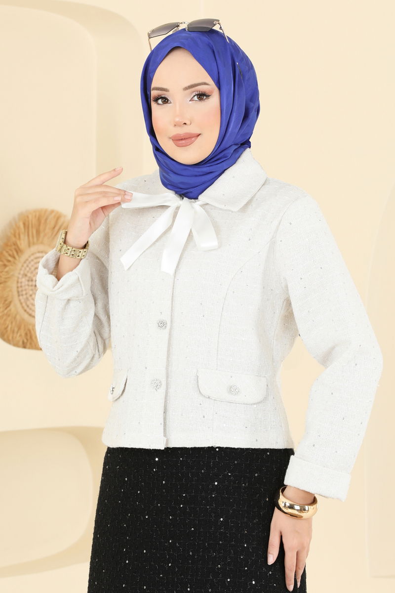 Elegant and chic, the Lace-Collared Tweed Suit is an ideal choice for modest attire. Suitable for use in autumn and winter, this attire is comfortably maintained with a 30-degree gentle wash. The tweed fabric provides a delicate touch while offering durability. Featuring a shirt collar and front button details, it successfully blends classic and modern styles. The included lace can be optionally removed or used, allowing for versatile styling. The zippered waist on the skirt facilitates easy wear, while pocket details on the jacket and skirt complete the sophisticated look.