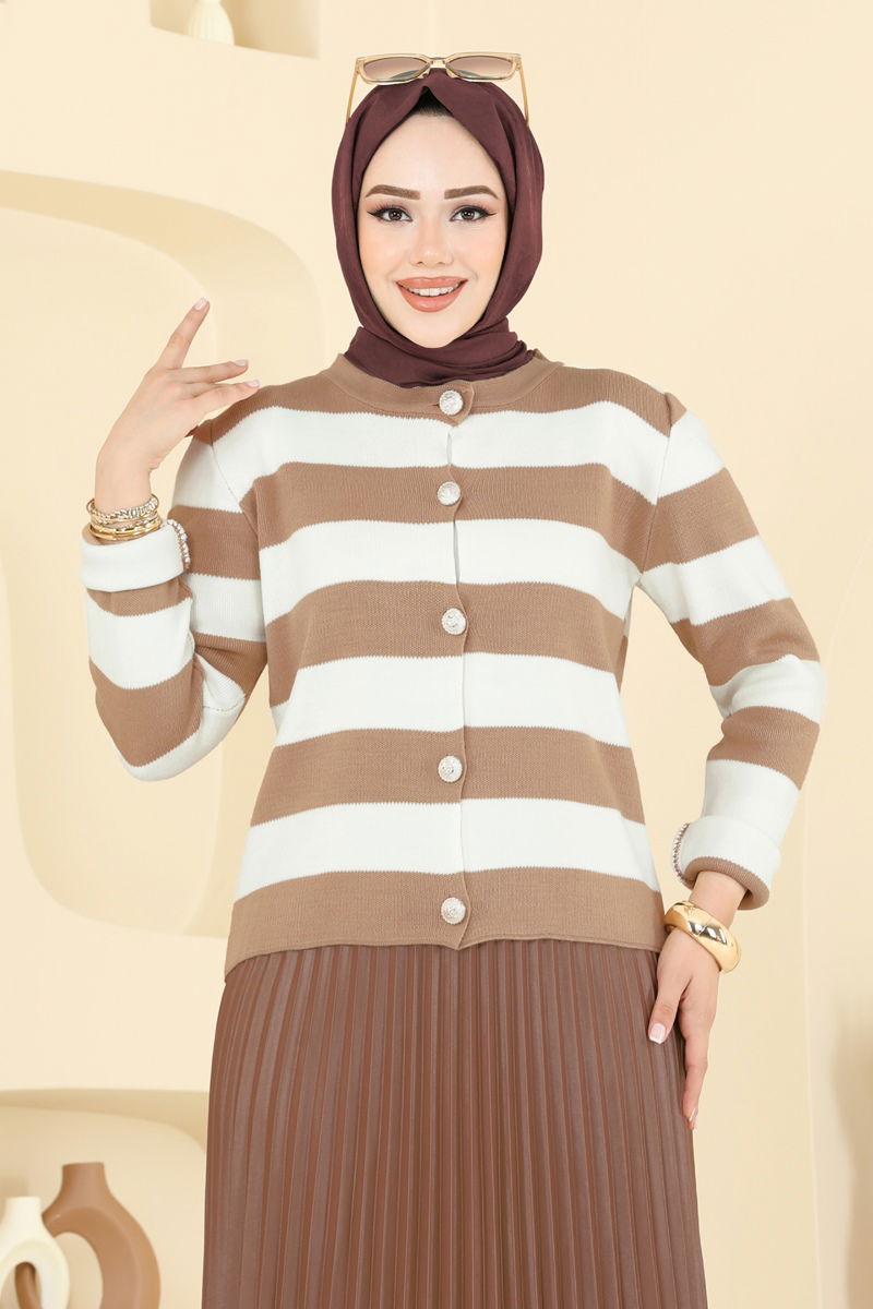 The Striped Detail Cardigan Set stands out with its modern and elegant design. Ideal for autumn and winter, this hijab suit combines comfort and elegance with a mix of knitted and satin fabrics. It can be washed gently at 30 degrees. The crew neck and front buttons make it convenient to wear. The elastic waist of the skirt offers comfort throughout the day. The product is unlined and available in size S-M on the model. Cardigan is standard.