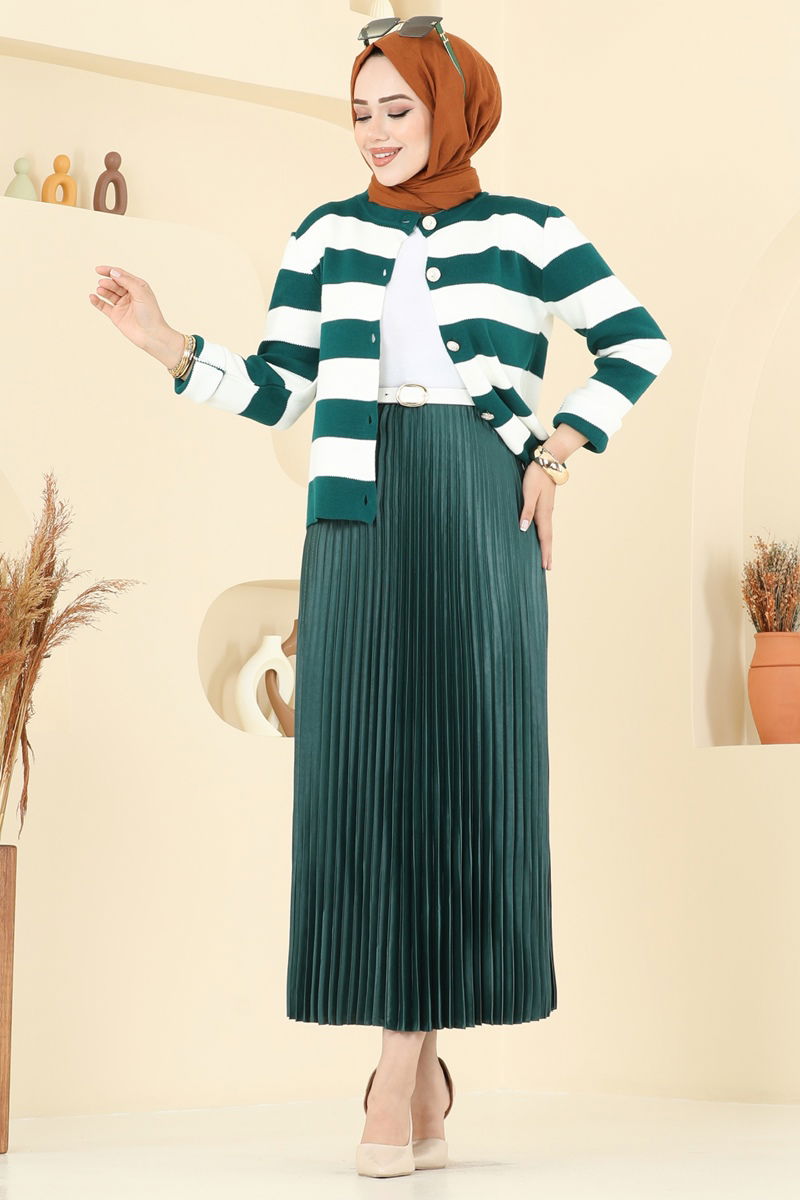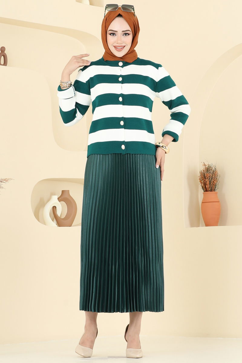 The Striped Detail Cardigan Set stands out with its modern and elegant design. Ideal for autumn and winter, this hijab suit combines comfort and elegance with a mix of knitted and satin fabrics. It can be washed gently at 30 degrees. The crew neck and front buttons make it convenient to wear. The elastic waist of the skirt offers comfort throughout the day. The product is unlined and available in size S-M on the model. Cardigan is standard.