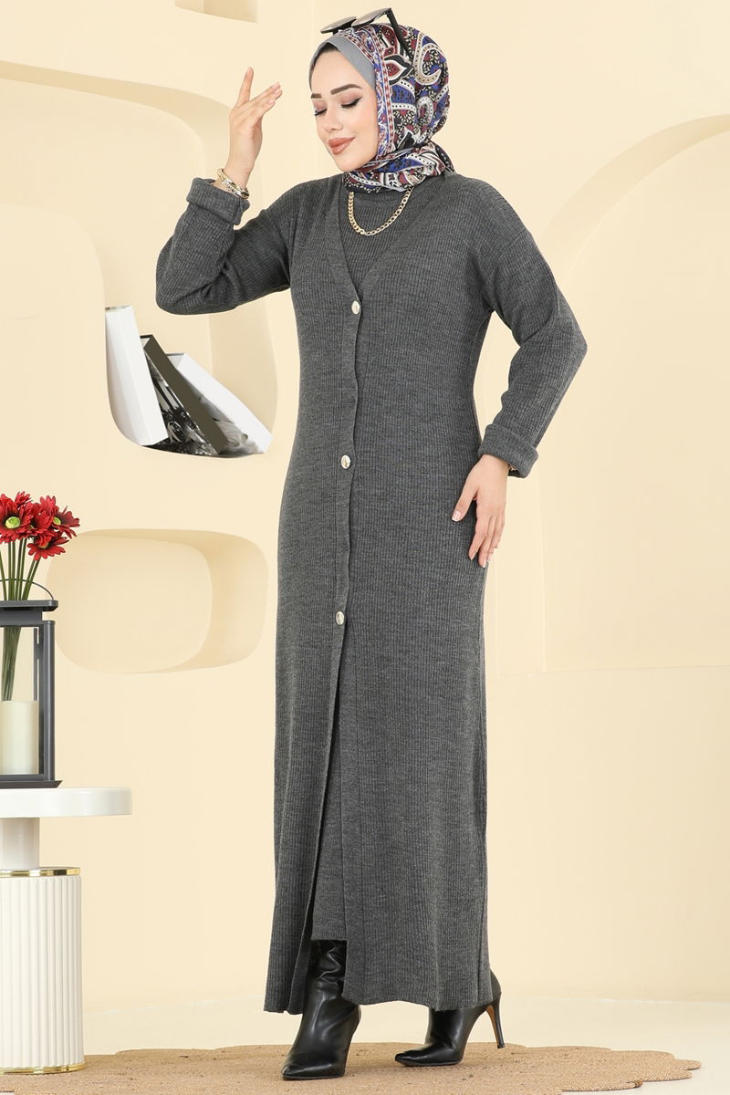 The Button-Front Dress Knit Set in the COMBINE model presents modest wear in a modern and stylish form. Ideal for autumn and winter, this set is made from knit fabric and is unlined, suitable for gentle washing at 30 degrees. It features easy-to-use buttons on the front. The inner dress is sleeveless and can also be worn separately. Comprising two pieces, this set allows you to express your style freely.