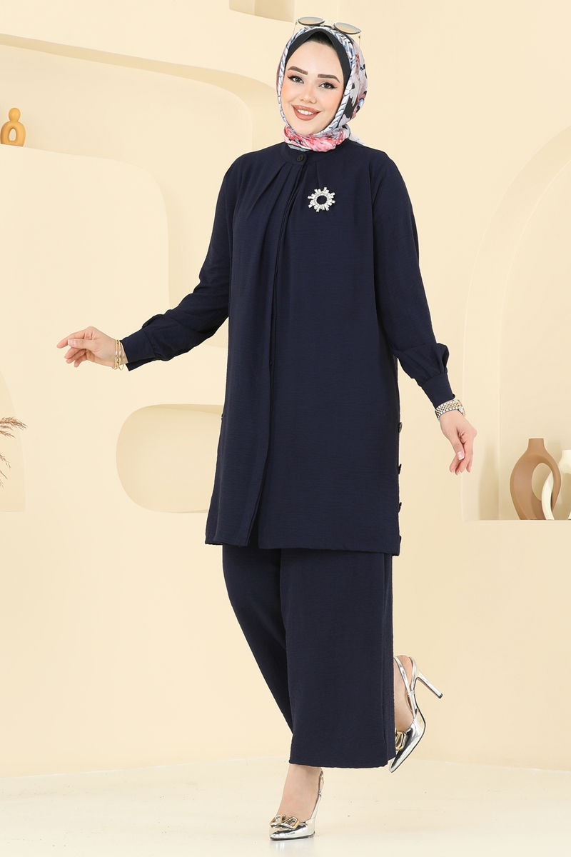 The Slit Buttoned Hijab Suit offers a modern and elegant design, suitable for all-season use. Made from aerobin fabric, it provides lightweight comfort and breathability throughout the day. This suit can be machine washed on a gentle cycle at 30 degrees Celsius and features a mandarin collar and hidden buttons for a sleek finish. The unlined design keeps it light, while the elastic waistband on the trousers ensures ultimate comfort. Active button cuffs on the tunic and trousers add functionality. Ideal for both everyday wear and special occasions.