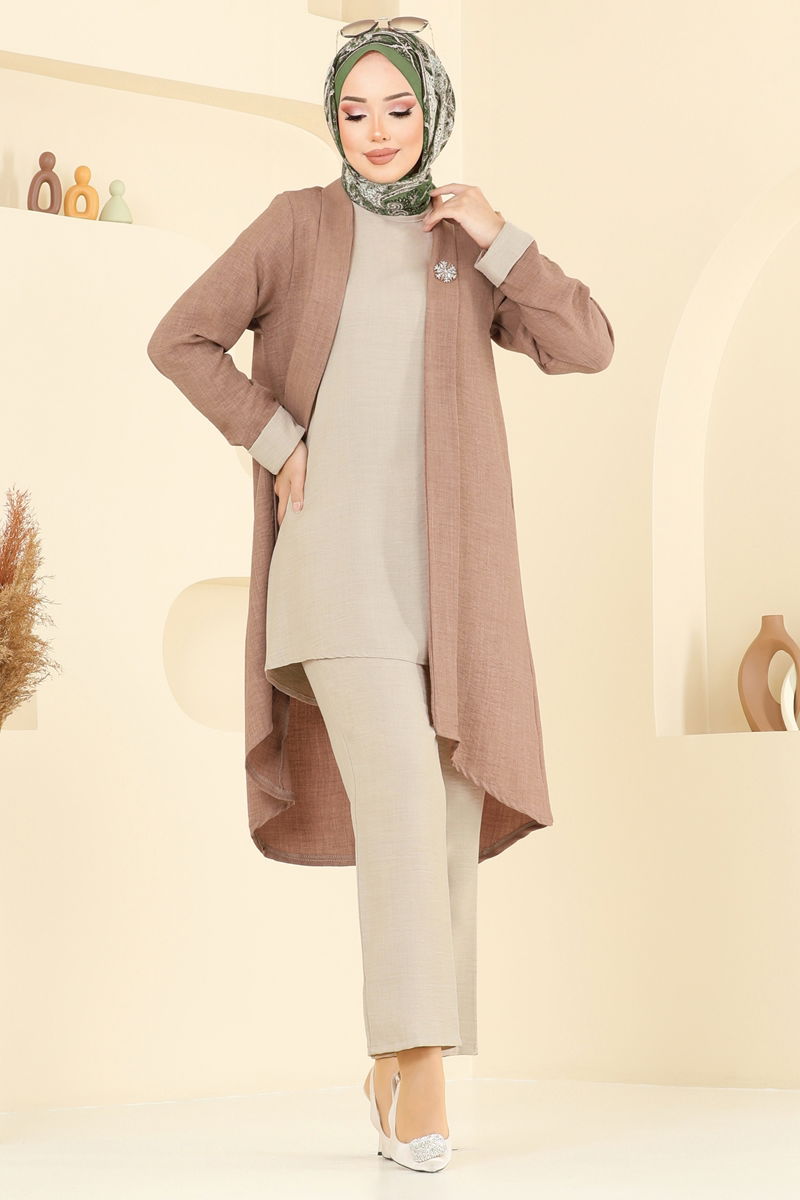 The Asymmetric Cut Three-Piece COMBINATION is an elegantly designed modest wear outfit made from sofia linen, suitable for all seasons. It features a liner-free crew neck, sleeveless inner tunic, and an elastic waist on the pants. Offering both style and comfort, this set can be washed at 30 degrees on a gentle cycle. The practical buttoned back makes it easy to wear, ensuring it becomes a favorite in your wardrobe with its perfect fit and chic design.
