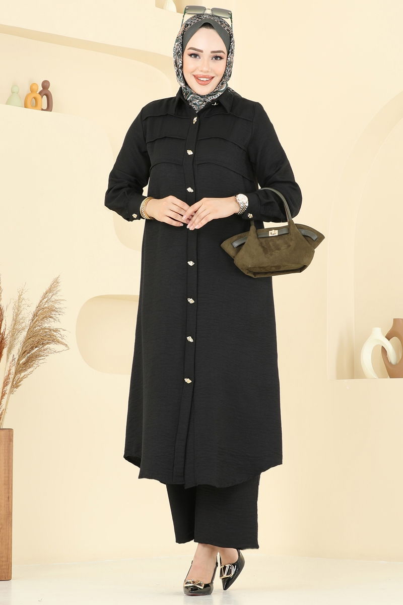 Product Feature : It is a new season hijab fashion product. The product has a Shirt collar. The product has From the front buttons. Unlined. The waist of the trousers is elastic. Cuff buttons are active. There may be a tonal difference in the product due to concept photo shoots.