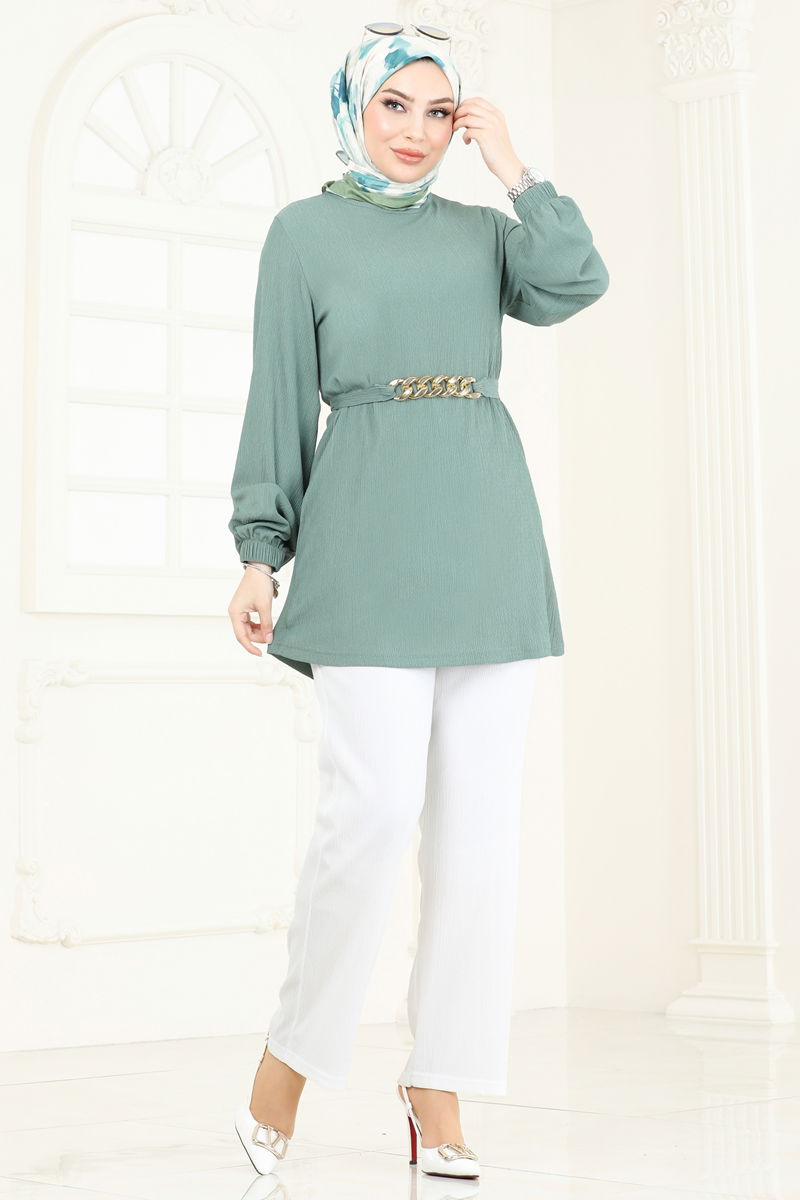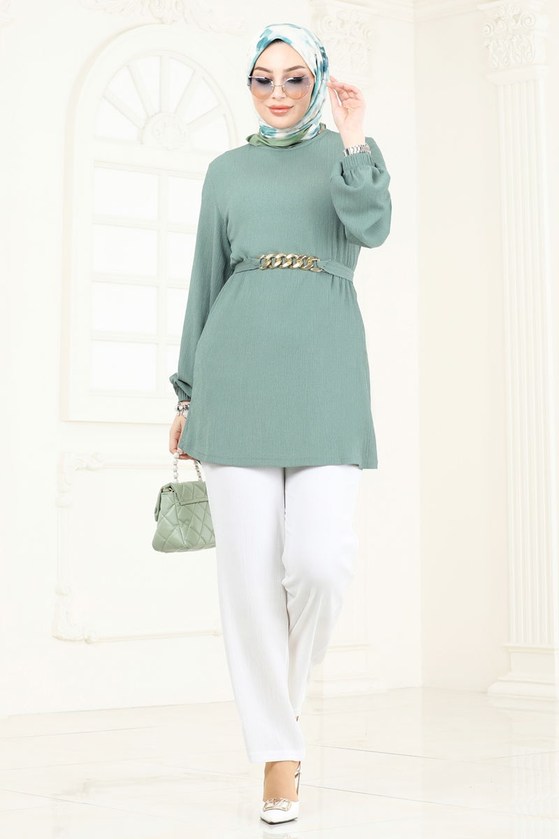 The Chain Belted Modest Suit is a stylish combination that can be comfortably worn in all seasons. This product, which can be washed at 30 degrees with a delicate wash setting, is made from crinkled fabric and features a bicycle neckline. The unlined suit adds a modern touch to modest clothing. The suit comes with pants that have an elastic waist and wristbands. The belt can be optionally used, though the chain is attached to the product. The model is 167 cm tall, with a chest of 90 cm, waist of 70 cm, hips of 100 cm, and weighs 59 kg.