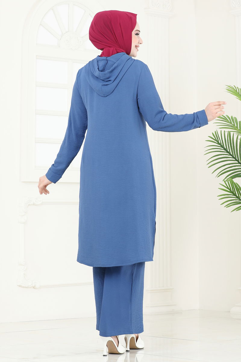 Product Feature : It is a new season hijab fashion product. The product has a Hooded collar. The tunic has a side slash.. Unlined. The coat of arms detail is glued. The hood is sewn to the product. The waist of the trousers is elastic. There may be a tonal difference in the product due to concept photo shoots.