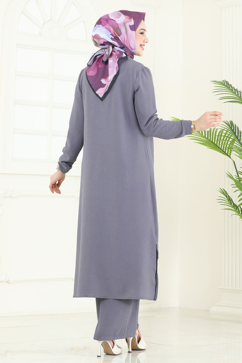 The Lace Collared Set offers a comfortable yet stylish design, making it an ideal choice for those who embrace modern lines in modestwear. This set is suitable for all-season wear and can be washed at 30 degrees on a gentle cycle, crafted from aerobin fabric. The tunic features side slits and front button closures for functionality. With its eye-catching lace-collared design, this set provides comfort in your daily life, while the elastic waist on the trousers ensures maximum comfort.