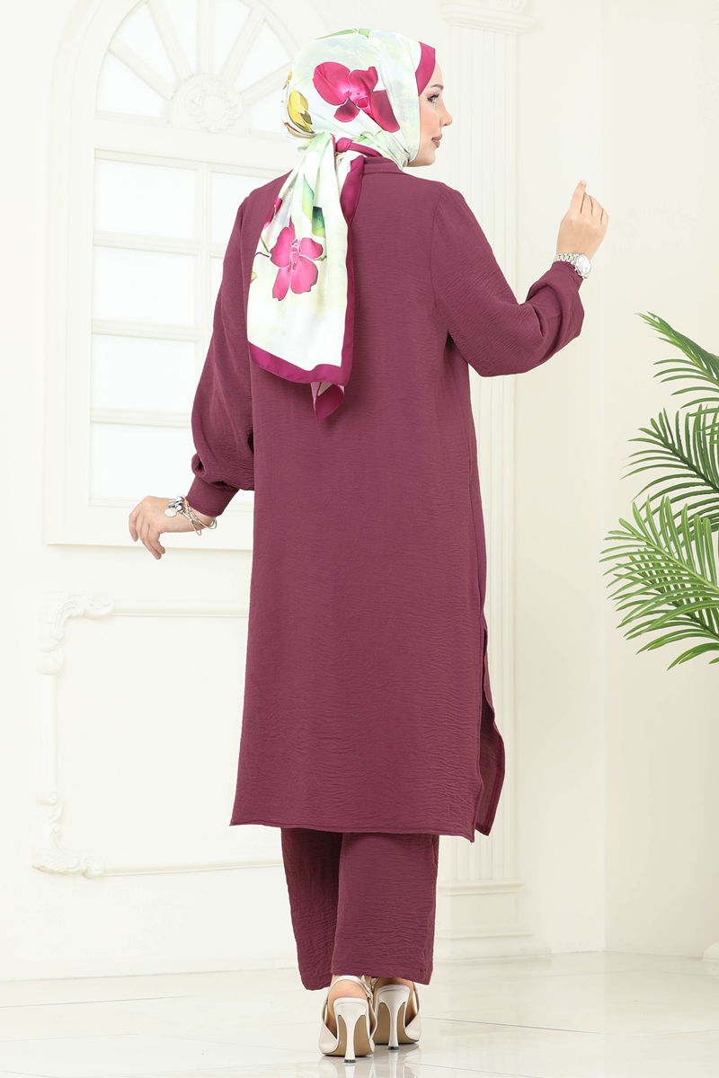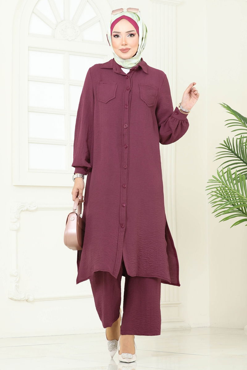 The Pocket Detailed Aerobin Set is a modest fashion piece suitable for all seasons. It can be washed at 30 degrees with gentle care. Made from aerobin fabric, it features a shirt collar and front buttons, making it stylish and functional. The tunic is side-slit and unlined for comfort, while the pants have an elastic waist for ease of wear. The breast pocket is functional and the cuffs feature buttons for added detail.
