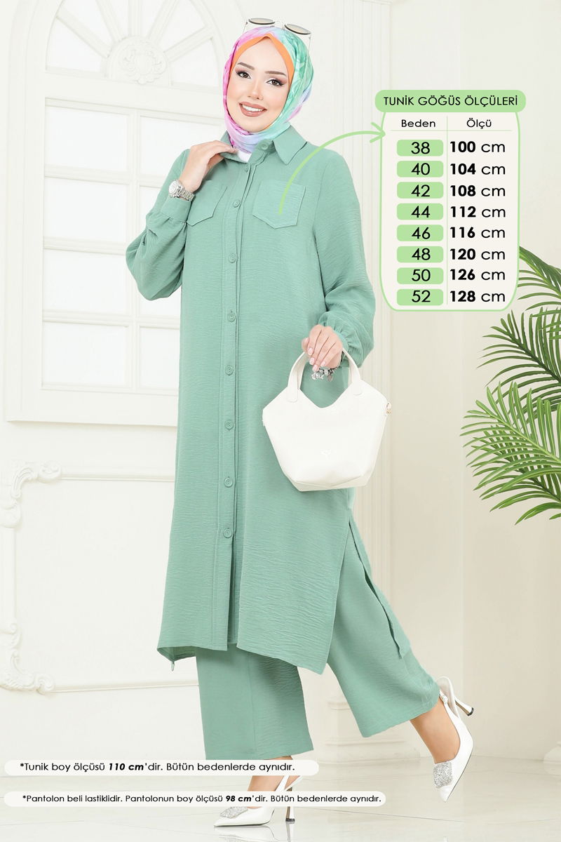 Product Feature : It is a new season hijab fashion product. The product has a Shirt collar. The product has From the front buttons. The tunic has a side slash.. Unlined. The chest pocket is active. The waist of the trousers is elastic. Cuff buttons are active. There may be a tonal difference in the product due to concept photo shoots.