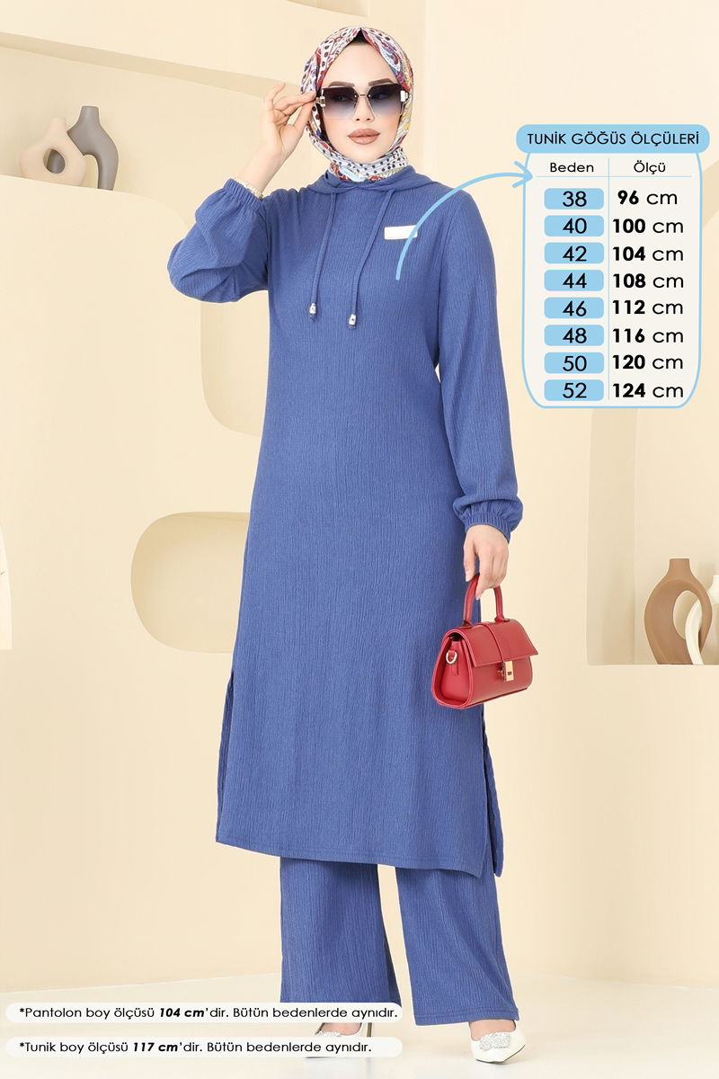 Made from delicate bürümcük fabric, it elevates your comfort while offering the convenience of washing without spin at 30 degrees. The hooded collar and side-slit tunic add elegance to your look. With its unlined structure for lightness and eye-catching arm details and a stylish hood, this outfit ensures you stay comfortable throughout the day with its elasticated waist pants.