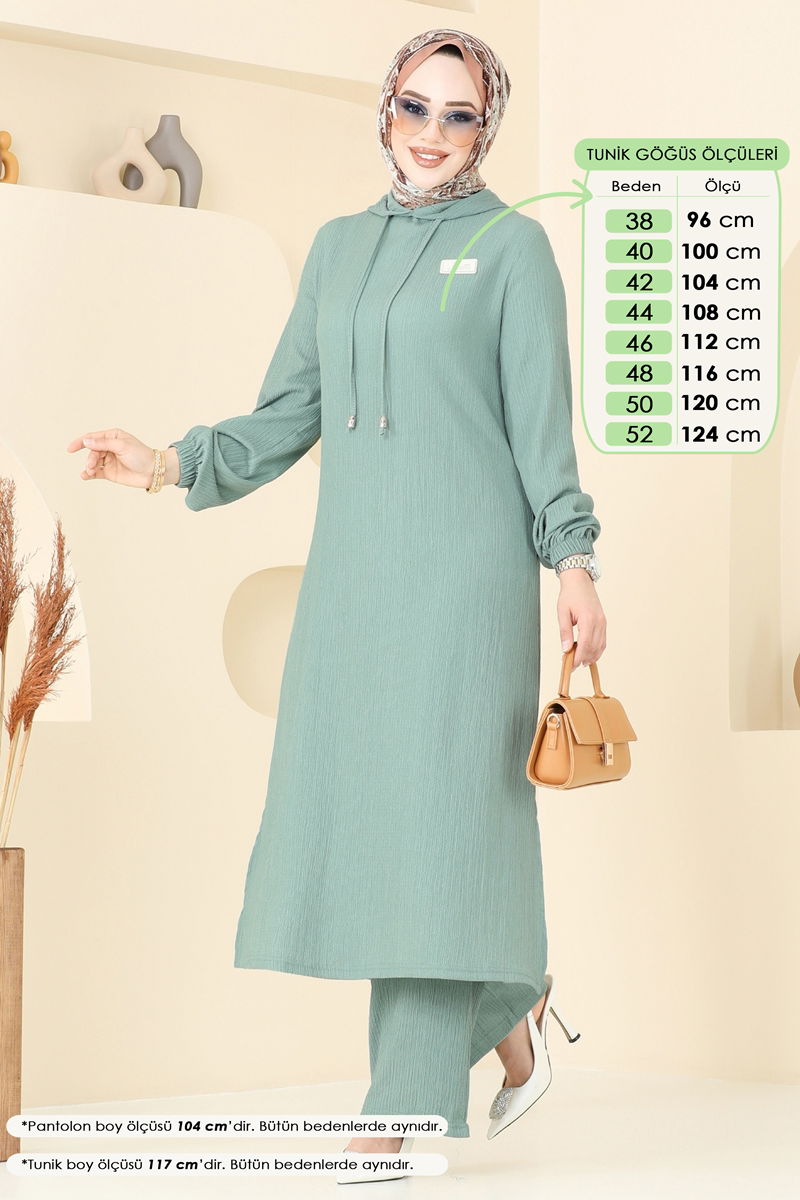 Product Feature : It is a new season hijab fashion product. The product has a Hooded collar. The tunic has a side slash.. Unlined. The coat of arms detail is sewn. The hood is sewn to the product. Lacing details are accessories. The waist of the trousers is elastic. The cuff is rubberized. There may be a tonal difference in the product due to concept photo shoots.