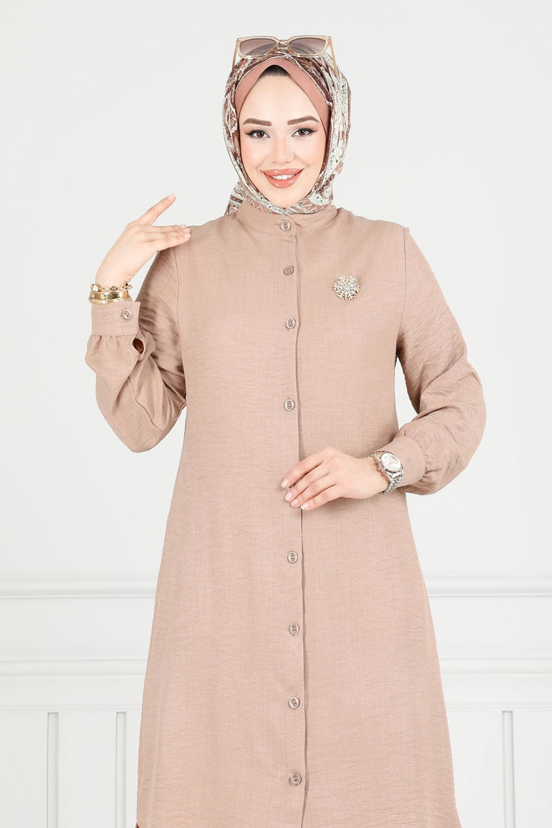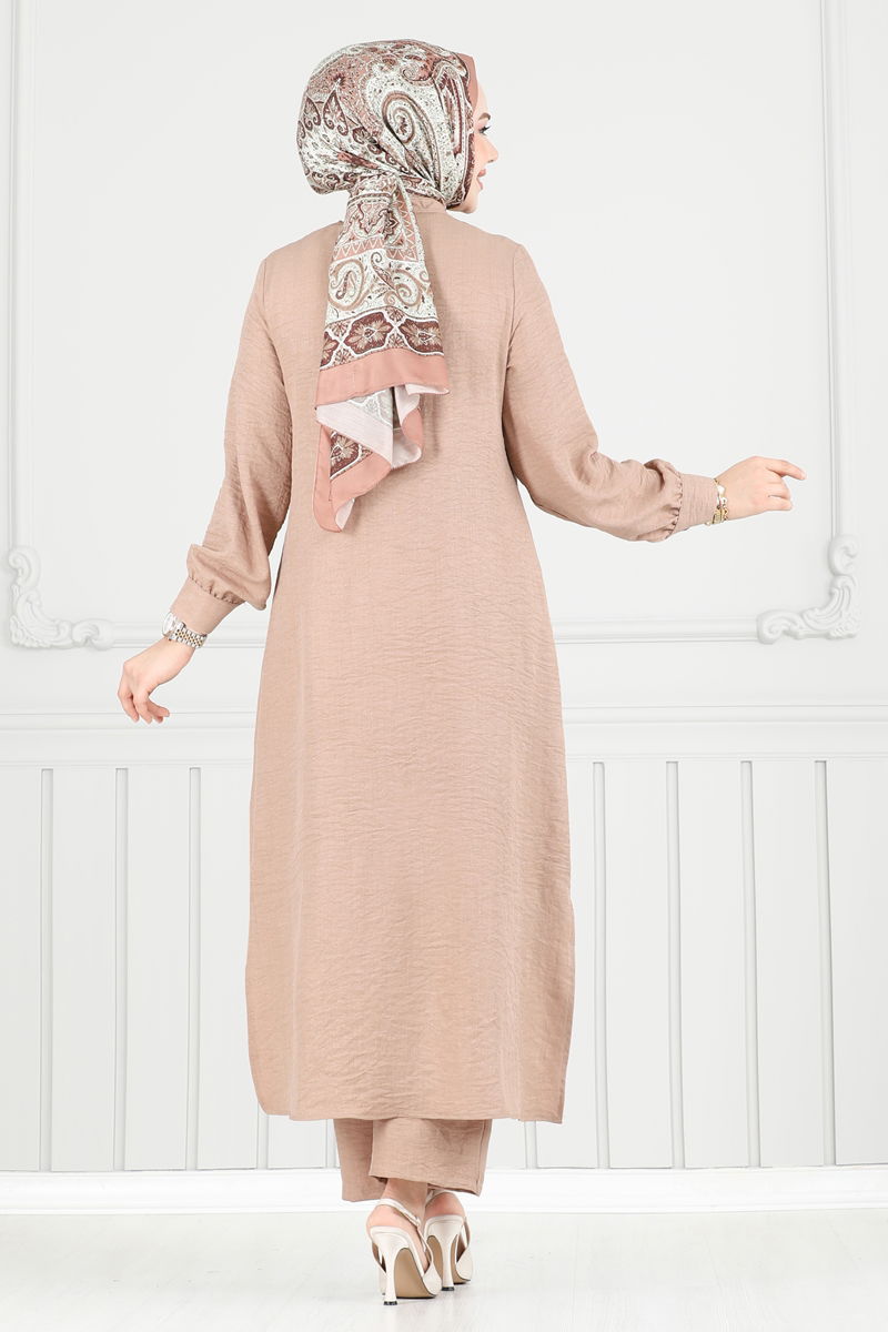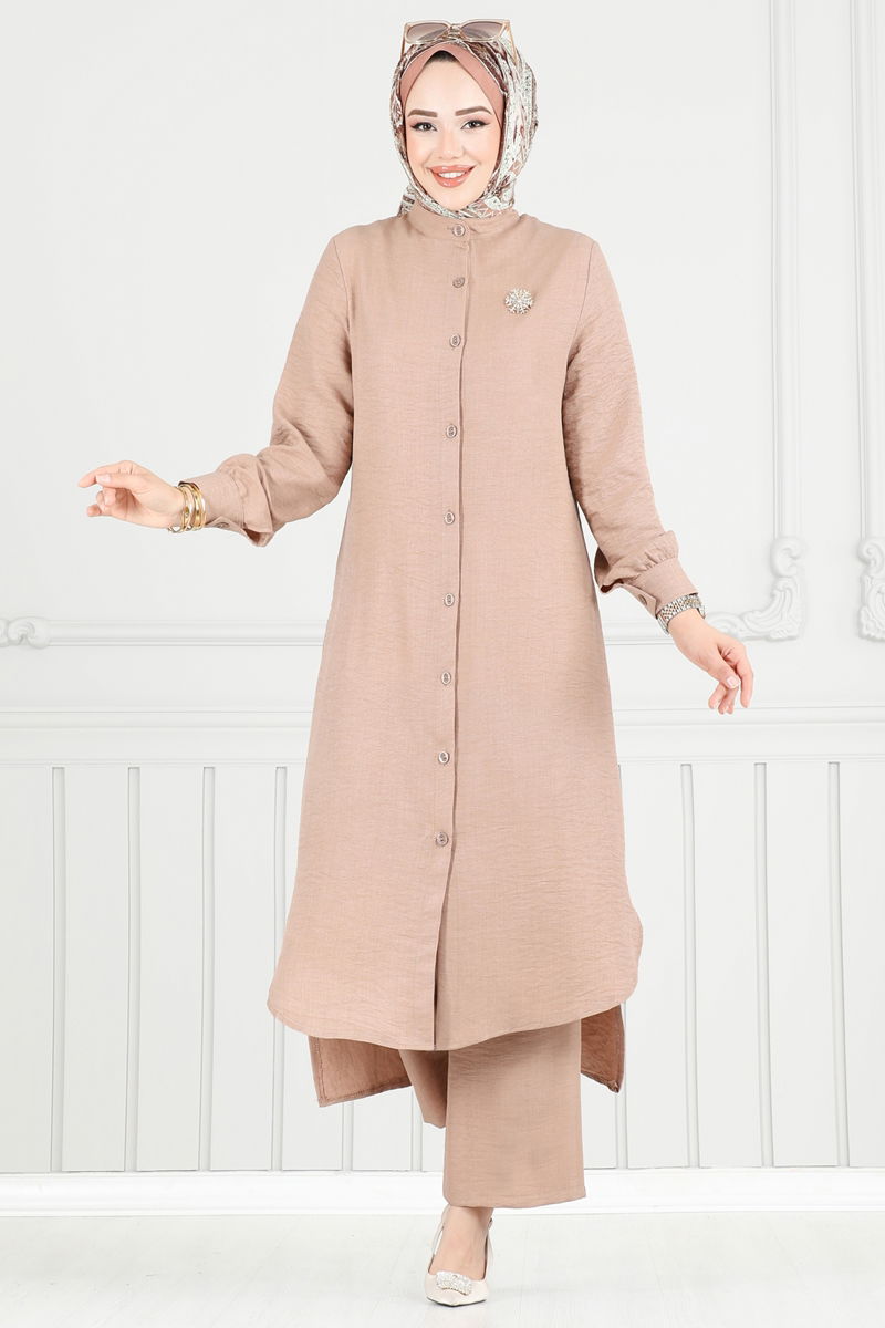Product Feature : It is a new season hijab fashion product. The product has a Half Judge collar. The product has From the front buttons. The tunic has a side slash.. Unlined. Accessories are not included. Blouse is not included. Sample combination is made with the blouse to show the intended use of the product. The waist of the trousers is elastic. Cuff buttons are active. There may be a tonal difference in the product due to concept photo shoots.