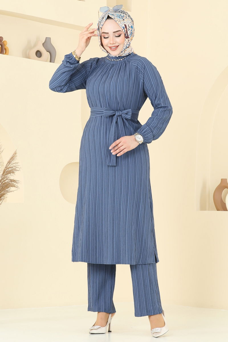 Product Feature : It is a new season hijab fashion product. It has a button that can be used from the back. The product is worn on the head. The product has a Judge collar. The tunic has a side slash.. Unlined. Stone details are pebble. Belt included, optional not available. The waist of the trousers is elastic. The cuff is rubberized. There may be a tonal difference in the product due to concept photo shoots.