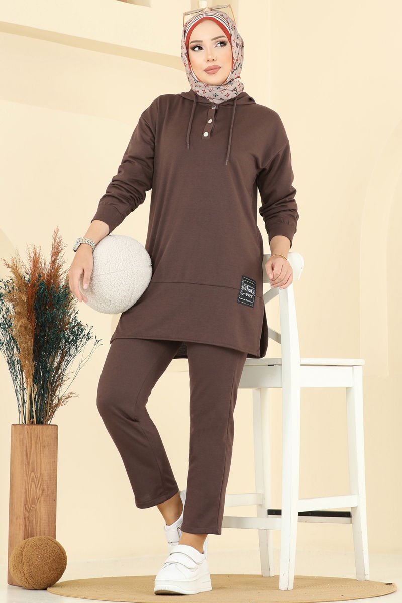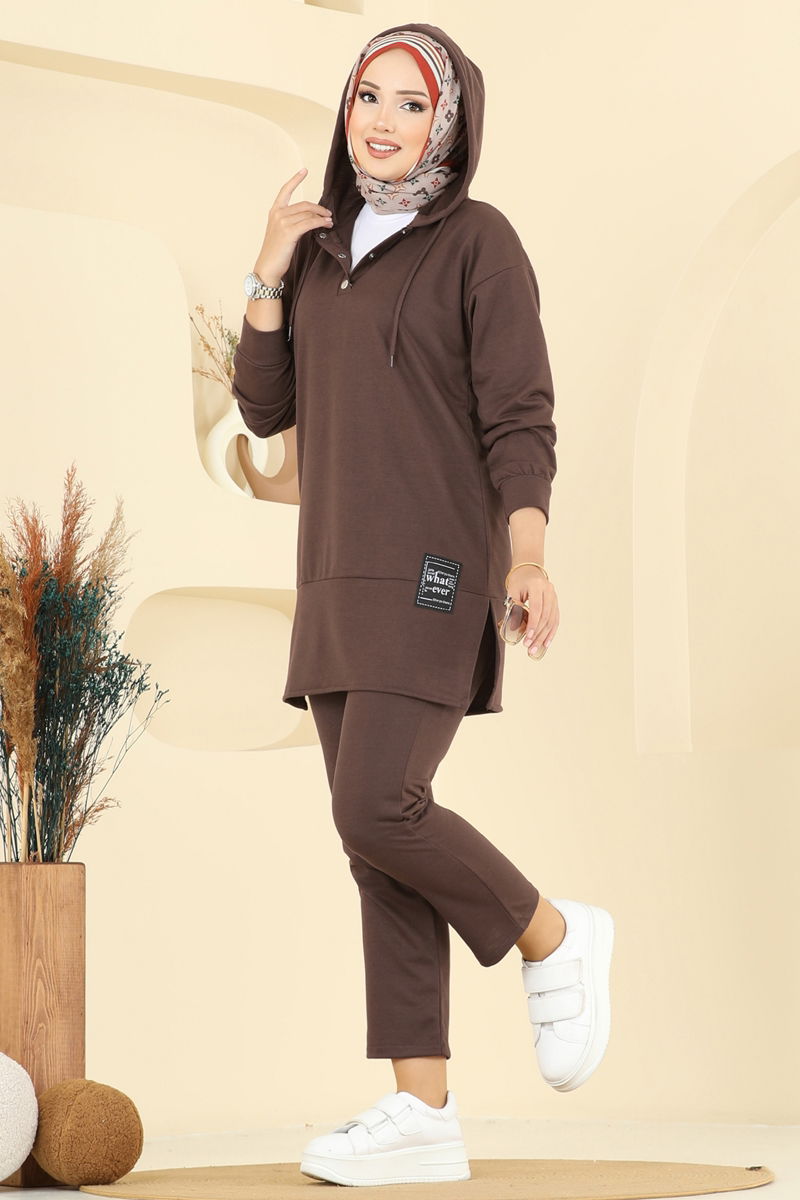 The Hooded Two-Yarn Set COMBO is a stylish modest wear suitable for all seasons. Made from dual thread fabric, this ensemble offers a practical and comfortable experience with its hooded neckline and half-button front. The model displayed in size M features detailed stitching and an elastic waistband on the trousers, ensuring comfort throughout the day. This combination, which includes both a tunic and trousers, will complete your daily outfit with elegance.