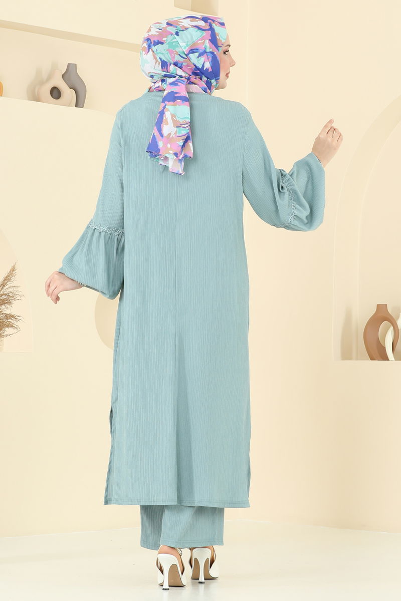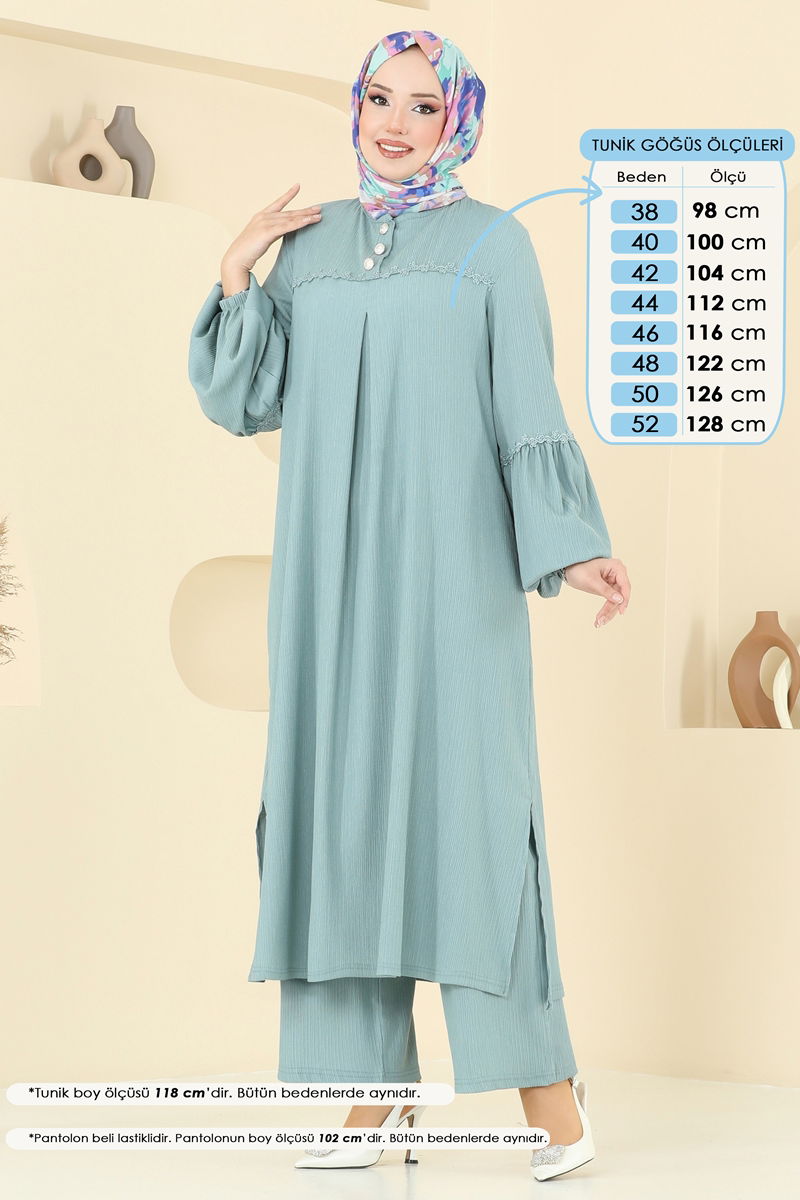 Product Feature : It is a new season hijab fashion product. The product is worn on the head. The product has a Cycling collar. The product has half front buttons. The tunic has a side slash.. Unlined. The guipure detail is sewn. The bottom of the product is wide. The waist of the trousers is elastic. The cuff is rubberized. There may be a tonal difference in the product due to concept photo shoots.