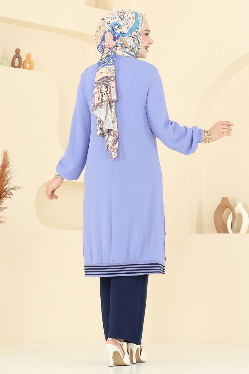 Slit Buttoned Aerobin Set is a specially designed modest wear combination perfect for all-season use. Recommended to be washed delicately at 30 degrees, this product is made from light and breathable aerobin fabric. Featuring a bicycle neckline, stylish side slits in the tunic, and a comfortable elastic waistband in the pants, it stands out with its functional design. The side buttons add an elegant touch as an accessory, making it an ideal choice for both daily wear and special occasions.