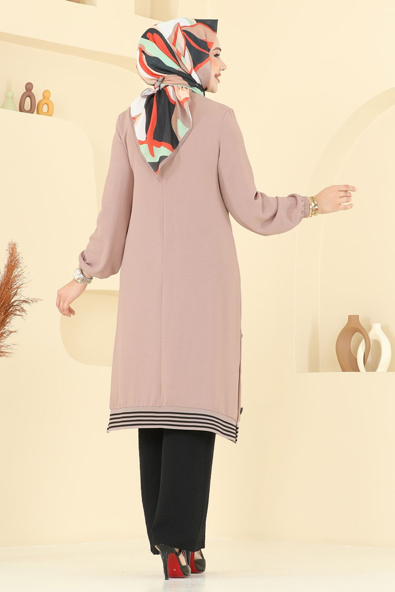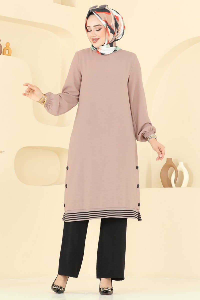 Slit Buttoned Aerobin Set is a specially designed modest wear combination perfect for all-season use. Recommended to be washed delicately at 30 degrees, this product is made from light and breathable aerobin fabric. Featuring a bicycle neckline, stylish side slits in the tunic, and a comfortable elastic waistband in the pants, it stands out with its functional design. The side buttons add an elegant touch as an accessory, making it an ideal choice for both daily wear and special occasions.