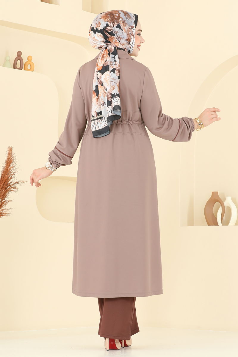 This elegant Belt Tunneled Double Set model offers a modern touch to modest wear. You can comfortably wear it in all seasons. Its special dabıl fabric can be washed at 30 degrees with gentle care and its practical zipper design makes it stylish and convenient. The shirt collar and tie design are eye-catching, while the elastic waistband of the pants provides comfort. The product is unlined and the model on it is size 38.