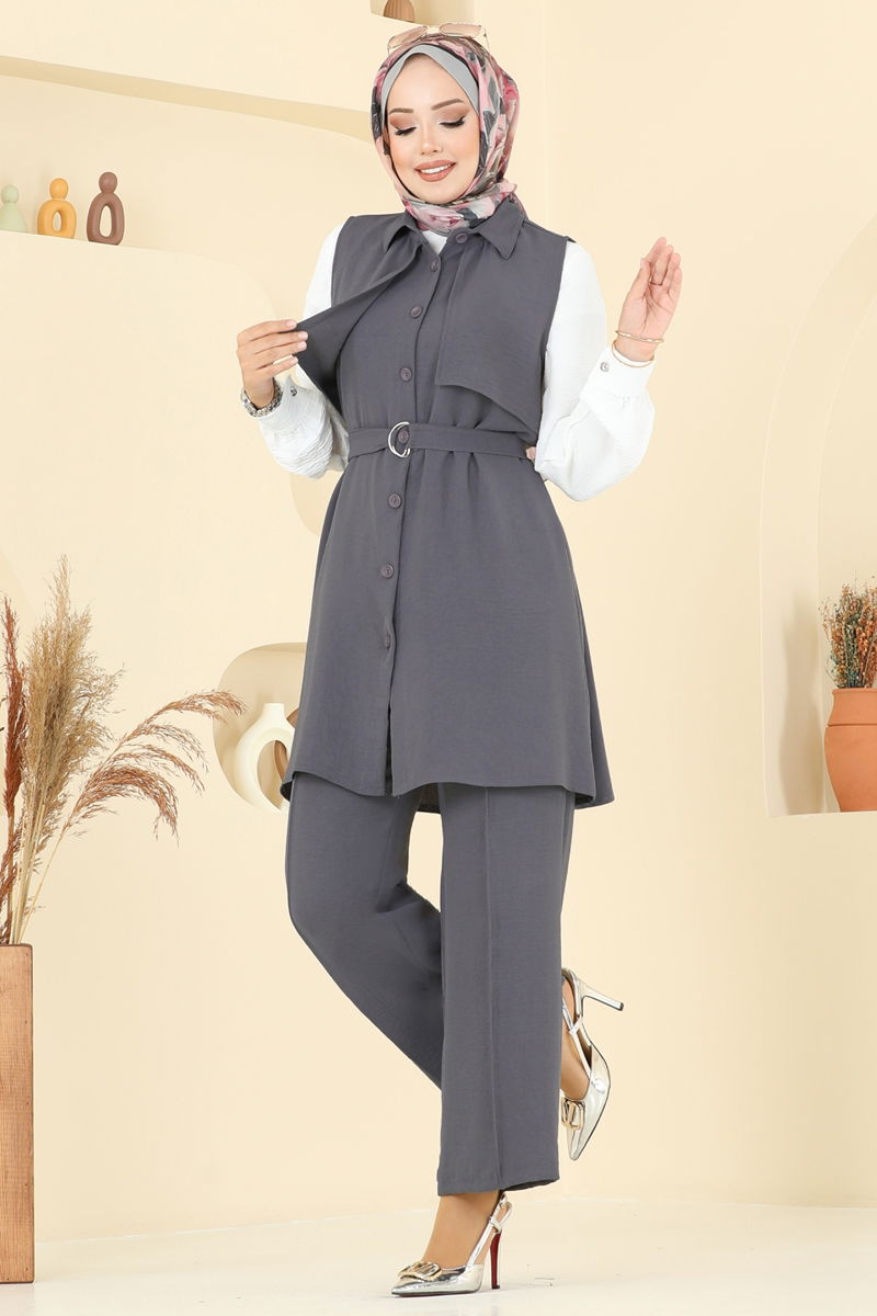 Product Feature : It is a new season hijab fashion product. The product has a Shirt collar. The product has From the front buttons. Unlined. Belt included, optional not available. The waist of the trousers is elastic. Cuff buttons are active. There may be a tonal difference in the product due to concept photo shoots.