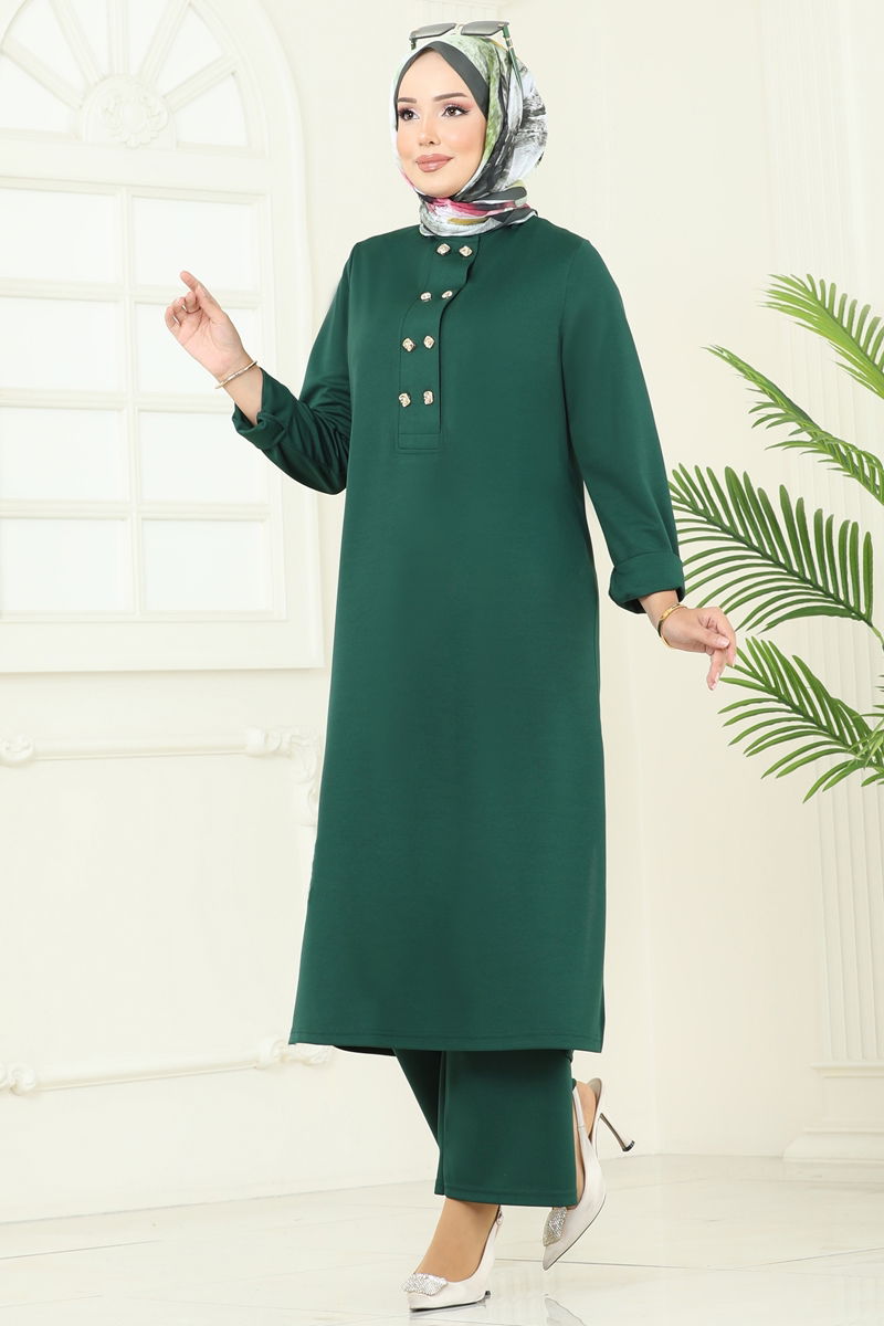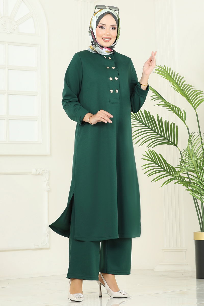 Product Feature : It is a new season hijab fashion product. The product has a Cycling collar. The tunic has a side slash.. Unlined. Buttons are accessories. The waist of the trousers is elastic. There may be a tonal difference in the product due to concept photo shoots.