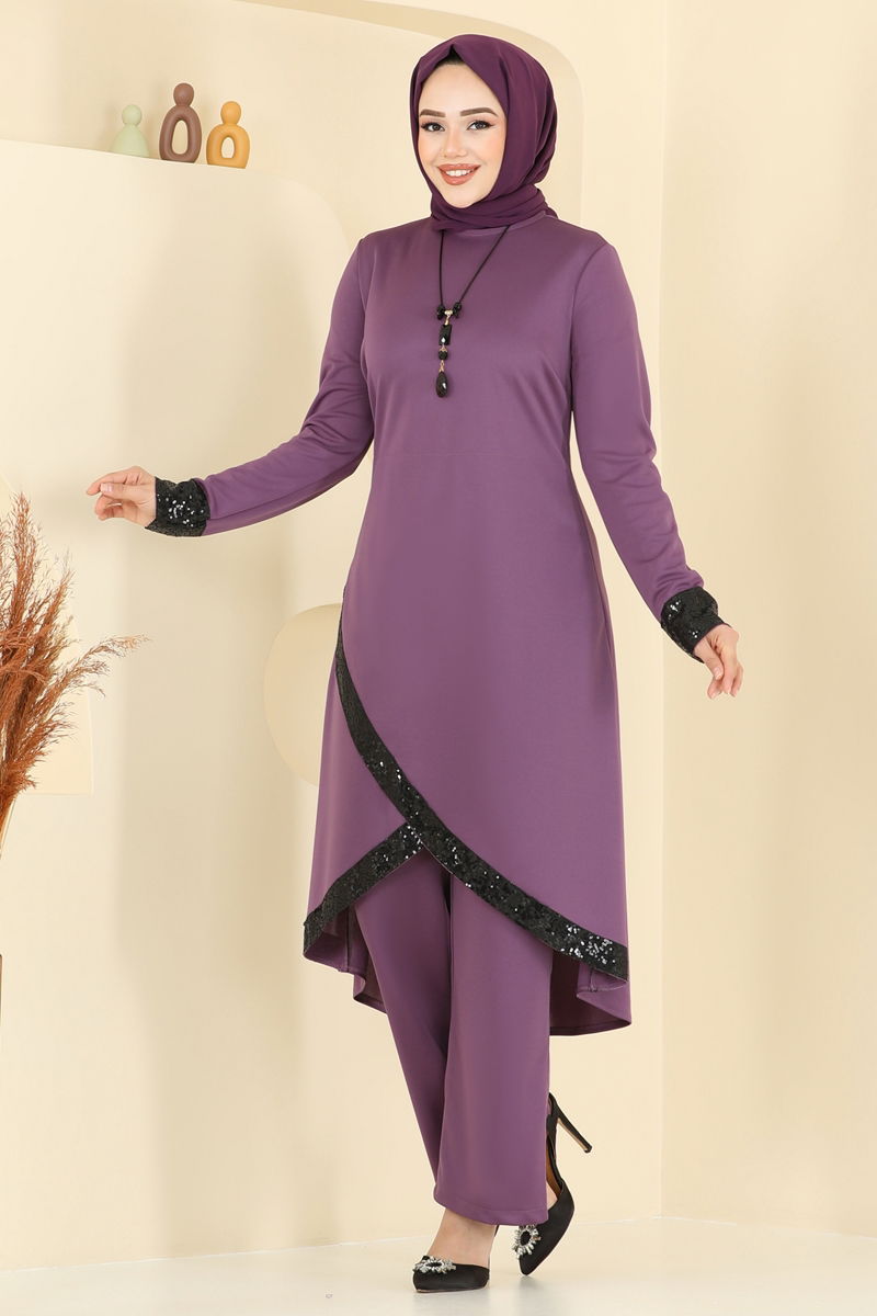 The Beaded Sequin Set with Necklace is a stylish and comfortable hijab clothing item. Suitable for all seasons, this set can be gently washed at 30 degrees. Made from Mira fabric, it features a crew neckline and is unlined. The product stands out with its zippered back and sewn sequin details. The included necklace can be optionally removed, and the trousers have an elastic waist. Available in various sizes to suit every woman's style needs.