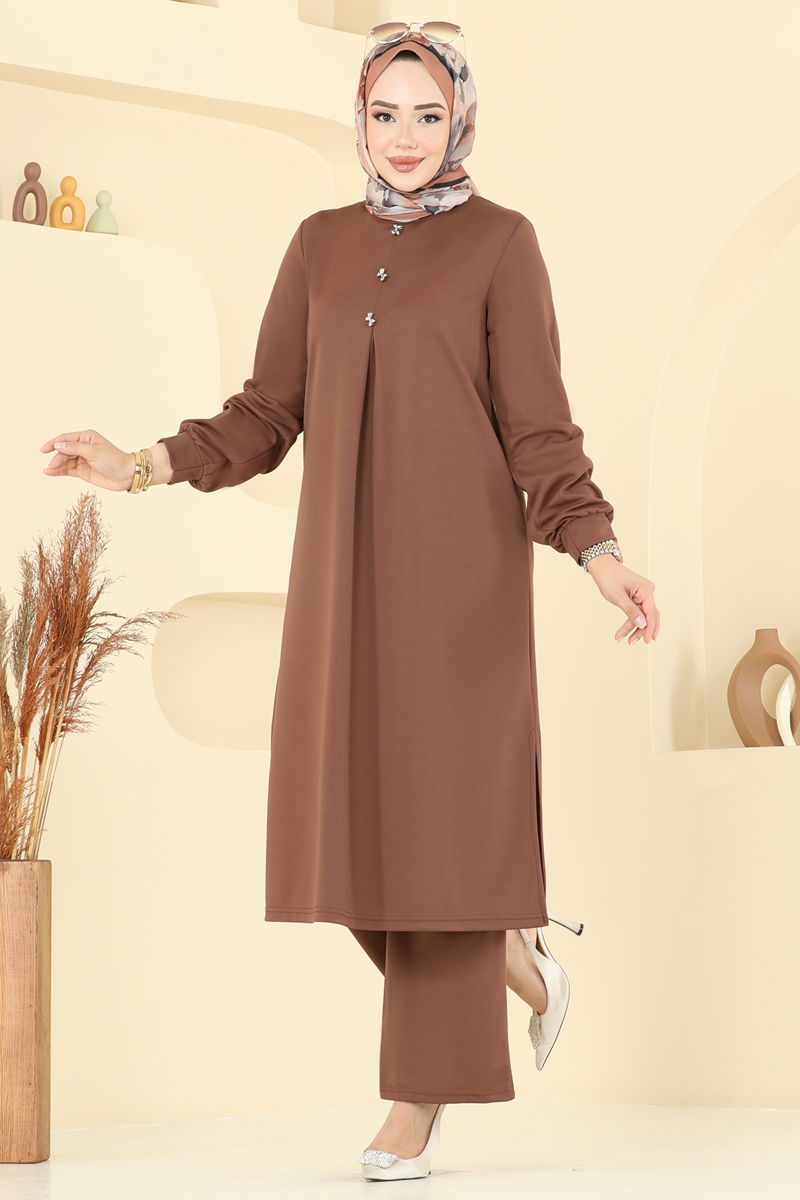 The Front Pleated Detail Suit TUNIC offers a blend of elegance and comfort. Suitable for all seasons, this modest wear piece is crafted from durable Mira fabric and can be washed at 30 degrees on a gentle cycle. Featuring a crew neck and side slits for a contemporary look, this tunic is unlined and adorned with decorative buttons. The product displayed on the model is size 38, available in various sizes to suit everyone.