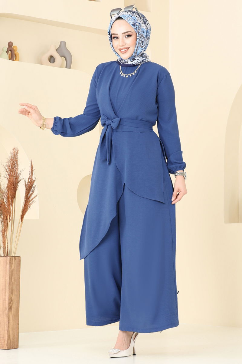 The Asymmetric Cut Aerobin Suit breathes new life into modest fashion with its chic and modern design. Suited for all seasons, this ensemble can be gently washed at 30 degrees. It's crafted from light and breathable aerobin fabric. The model features a back zipper and a bike collar, and it's unlined for maximum comfort. The included belt has stitched ends with a free middle section for easy adjustment, and can be optionally removed. The pants have an elastic waist, and both the tunic and pants come with elastic cuffs.
