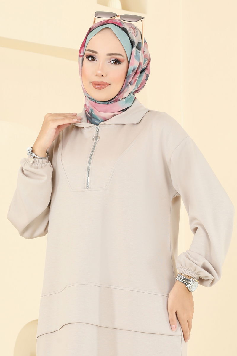 Product Feature : It is a new season hijab fashion product. It has a front zipper that can be used. The product has a Shirt collar. The tunic has a side slash.. Unlined. The waist of the trousers is elastic. The cuff is rubberized. There may be a tonal difference in the product due to concept photo shoots.