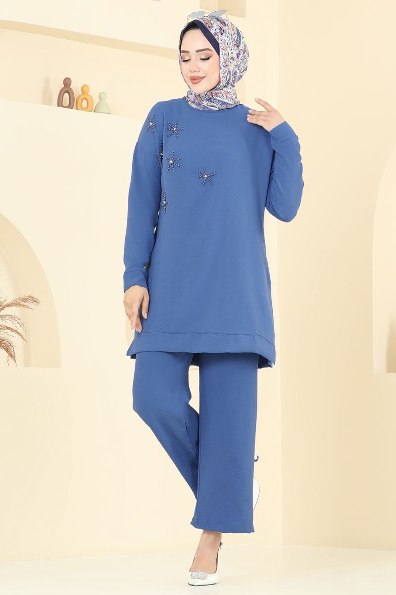 This elegant and chic Beaded Hijab Suit is perfect for maintaining your comfort and style throughout the four seasons. Made from aerobin fabric, the suit is easy to care for with its machine washable at 30 degrees feature on gentle cycle. Comprising a tunic and pants, this outfit offers a bicycle neckline and an unlined structure for comfortable wear. The elastic waist of the pants ensures comfort all day long, while the beaded details complete your elegance. The product is available in sizes 38-40 and is a perfect choice for all your special occasions.