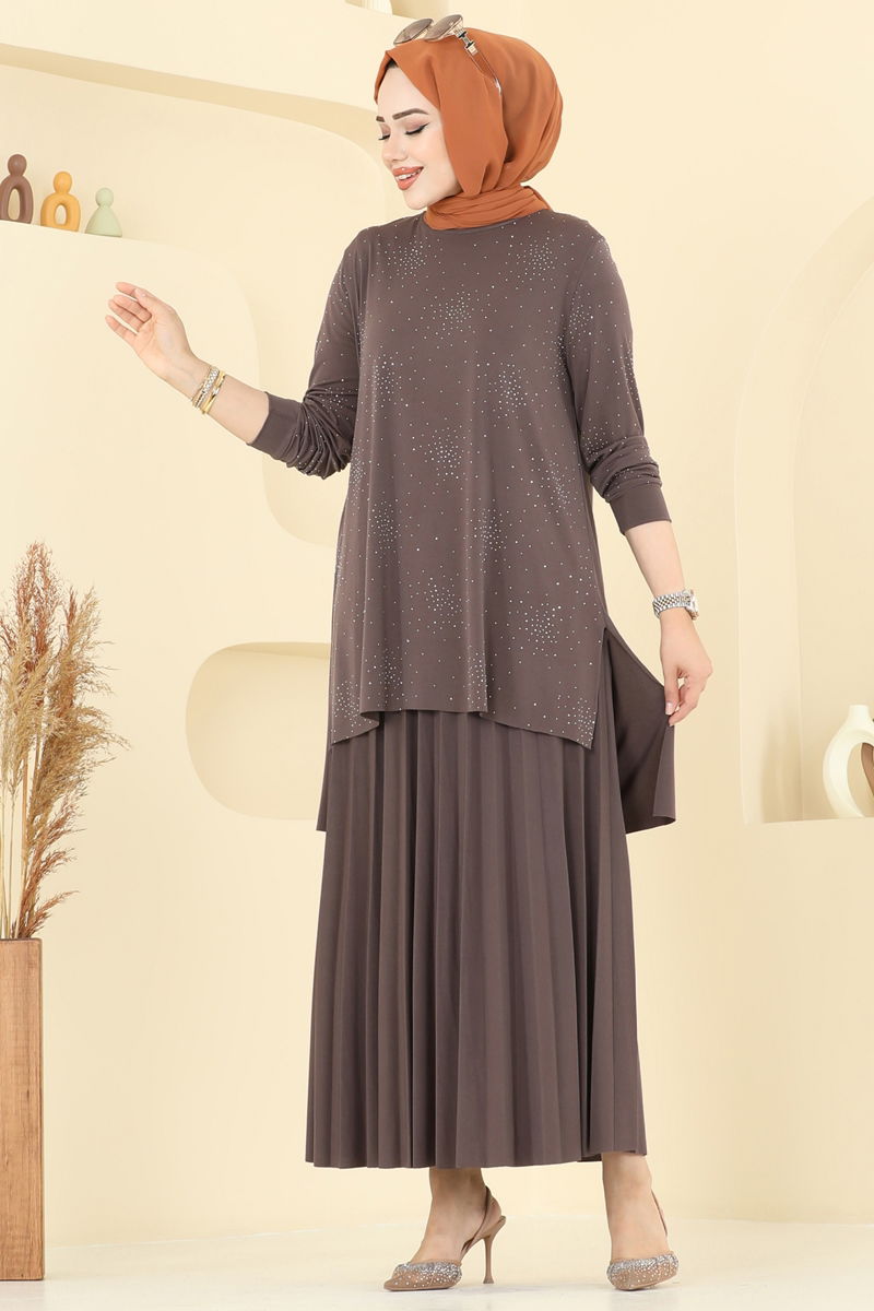 Product Feature : It is a new season hijab fashion product. The tunic has a side slash.. Unlined. The stones are glued. Belt is not included. The skirt waist is elastic. There may be a tonal difference in the product due to concept photo shoots.