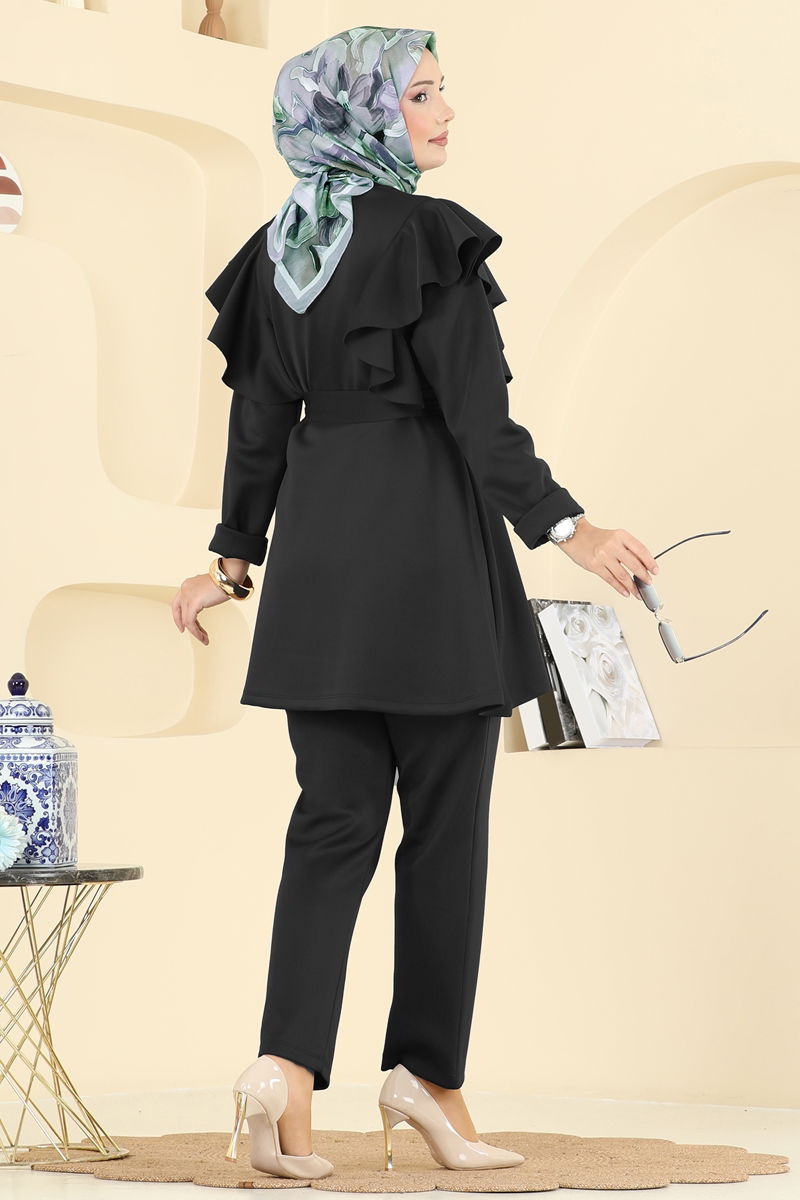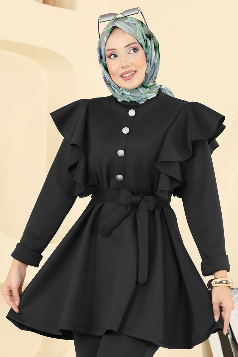 Adorned with ruffle details, the Dual Scuba Set offers a chic alternative for modest fashion. It can be comfortably used in all seasons. Its special scuba fabric maintains the shape and resists deformation. It can be washed at 30 degrees on a gentle cycle. The product features a semi-mandarin collar style that provides a contemporary look. The elastic waistband of the pants ensures a comfortable fit. The tunic and pants create a combination that offers high freedom of movement.