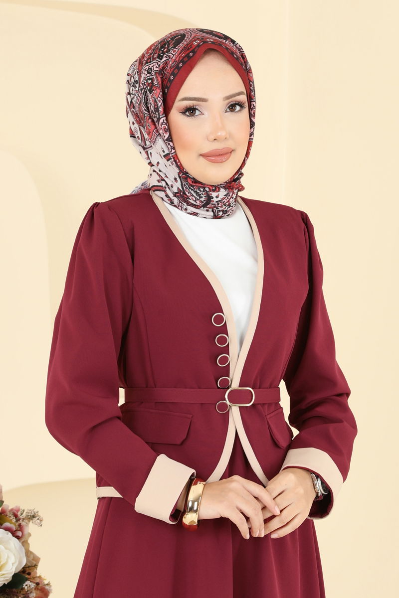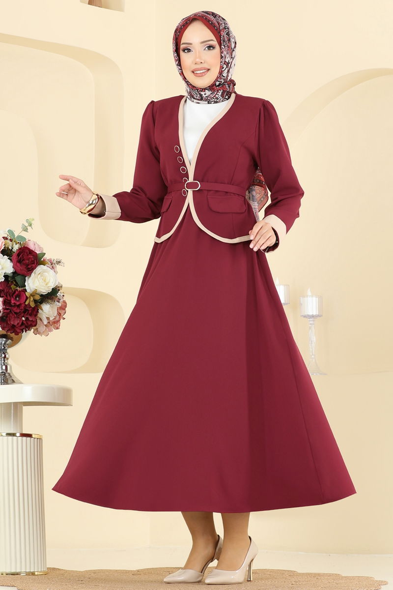 Accessorized Buttoned Skirt Set COMBINATION is a suitable choice for modest fashion, wearable in all four seasons. It can be washed at 30 degrees with delicate care settings and is made from durable Dabıl fabric, without lining. The product displayed is a size 38. The decorative buttons add an elegant flair to the ensemble. The belt is designed with sewn ends and a seamless middle for ease of use, and its application is optional. The elastic waistband of the skirt ensures comfort, while the jacket is designed without shoulder pads.