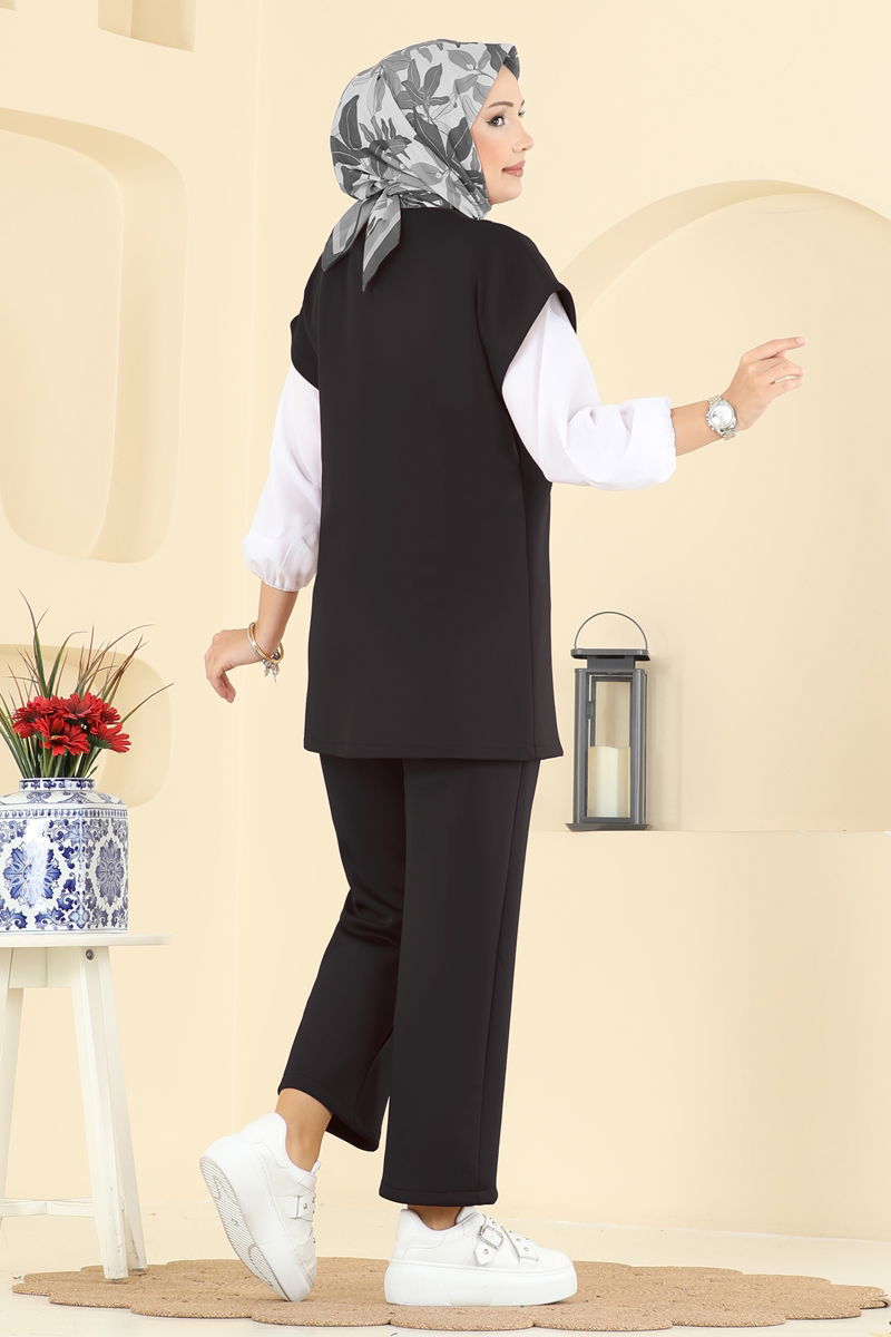 Elegant and comfortable, the Tie-Detail Scuba Suit is an ideal choice for those who embrace modern lines in modest fashion. This suit can be comfortably worn in all four seasons and is washable at 30 degrees on a gentle cycle. Made from flexible scuba fabric, it offers comfort all day long. The V-neck design adds an elegant touch, while its unlined structure keeps it lightweight. The product is designed with cape sleeves and comes in size M. Decorative buttons add a stylish accent, and the elastic waistband on the pants increases your comfort. Offered as a SET with VEST and PANTS, this suit will complete your chic appearance perfectly.