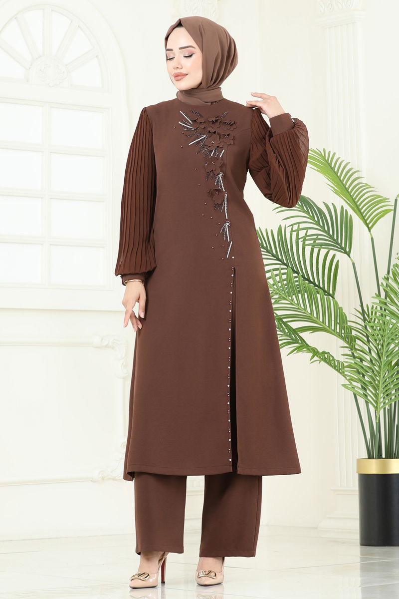 Product Feature : It is a new season hijab fashion product. The product has a Cycling collar. The tunic has a side slash.. Unlined. The product has a zipper at the from the back part. Bead details are my pocket knife. The stones are glued. The waist of the trousers is elastic. Cuff buttons are active. There may be a tonal difference in the product due to concept photo shoots.