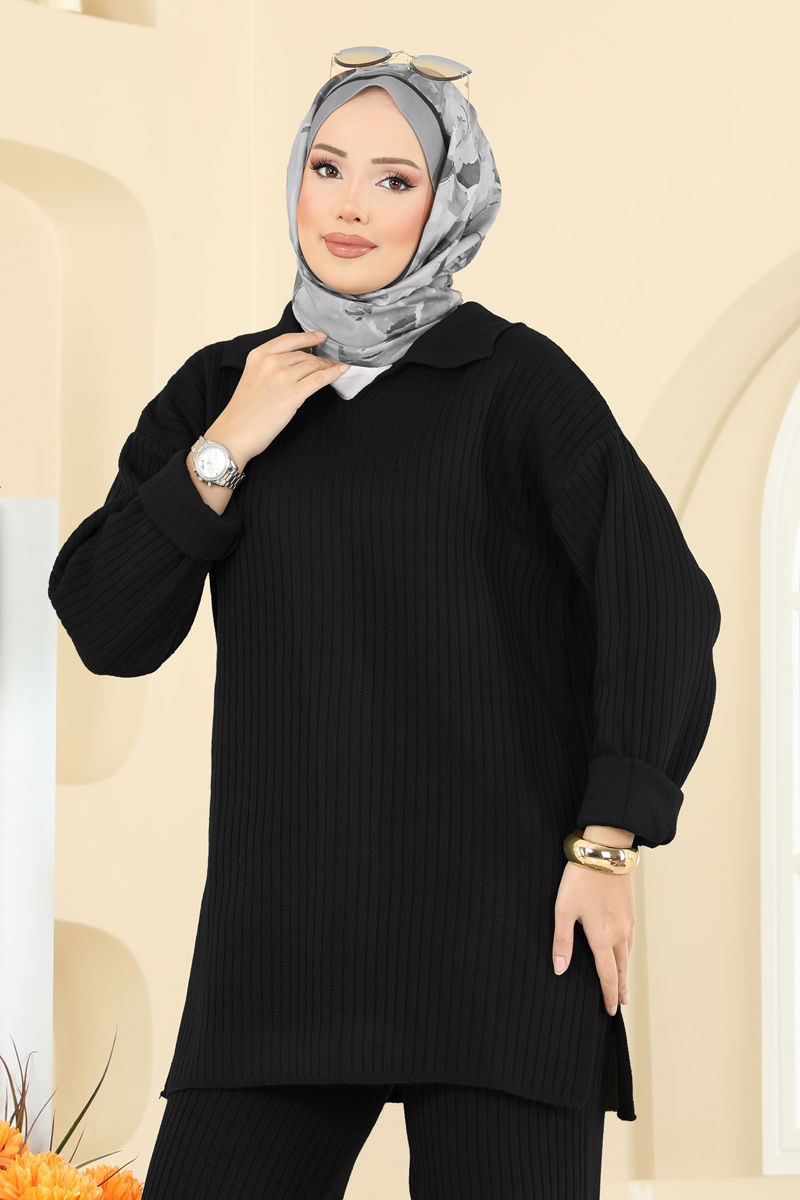 The Shirt Collar Knitwear Set, featuring the model, reflects the elegance of modern modest fashion. Suitable for Autumn and Winter, this set is crafted from delicate knit fabric. The shirt collar and side-slitted tunic offer a comfortable and stylish appearance. The waistband of the pants is elastic, ensuring maximum comfort. It is advisable to wash at 30 degrees on a gentle cycle. Available in standard size.