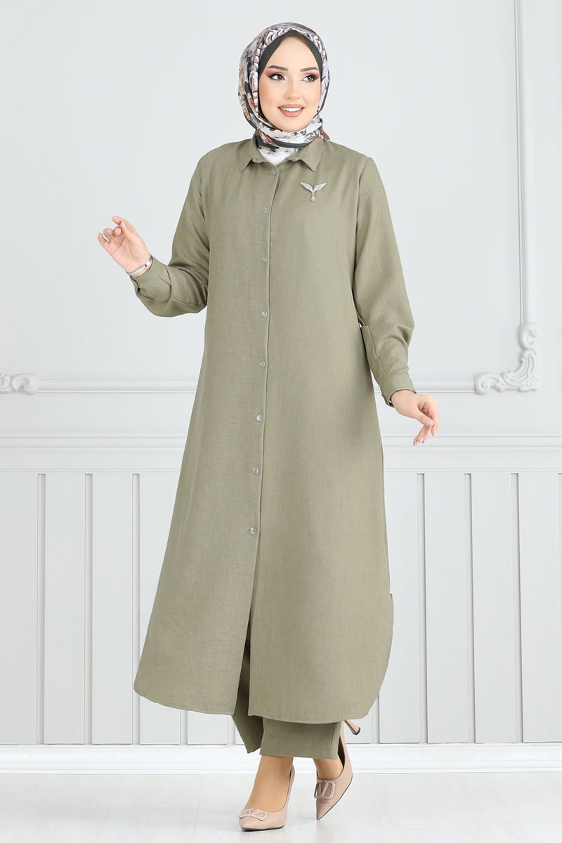 Product Feature : It is a new season hijab fashion product. The product has a Shirt collar. The product has From the front buttons. The tunic has a side slash.. Unlined. Accessories are not included. Blouse is not included. Sample combination is made with the blouse to show the intended use of the product. The waist of the trousers is elastic. Cuff buttons are active. There may be a tonal difference in the product due to concept photo shoots.