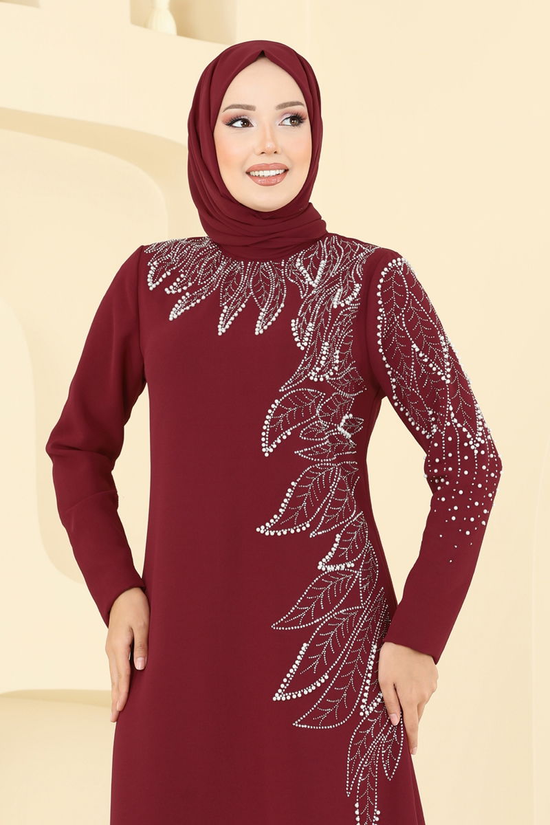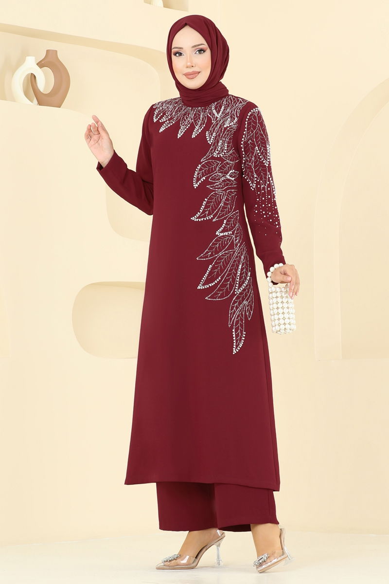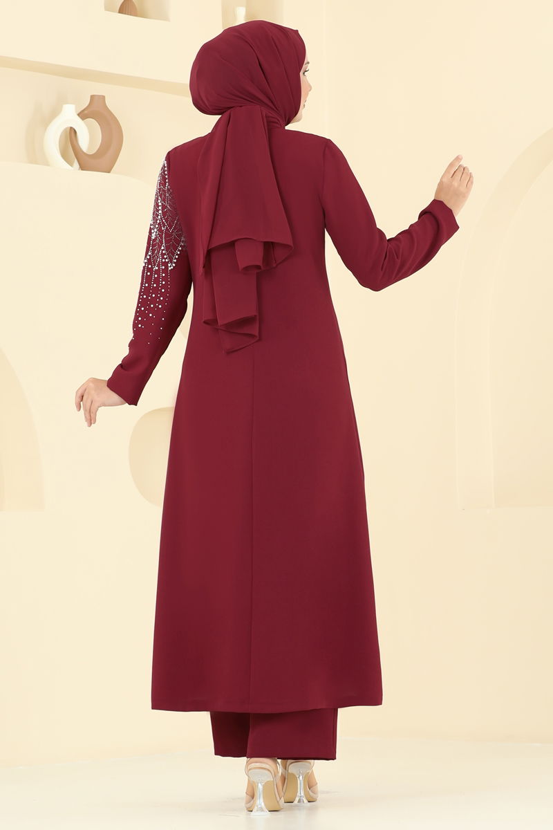 Product Feature : It is a new season hijab fashion product. The product has a Half Judge collar. Unlined. The product has a zipper at the from the back part. The pearls are pebbles and the stones are glued. The waist of the trousers is elastic. There may be a tonal difference in the product due to concept photo shoots.