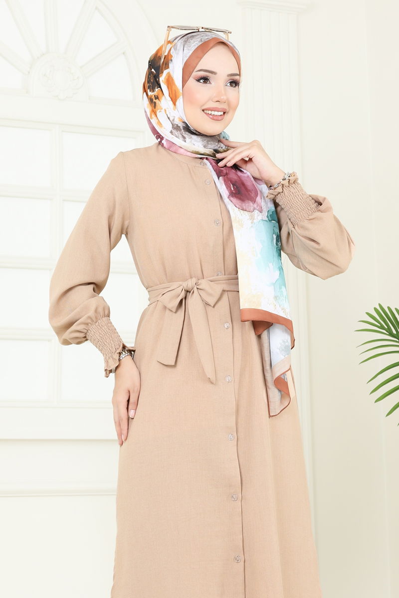 Product Feature : It is a new season hijab fashion product. The product has a Judge collar. The product has From the front buttons. The tunic has a side slash.. Unlined. Belt included, optional not available. Blouse is not included. Sample combination is made with the blouse to show the intended use of the product. Accessories are not included. The waist of the trousers is elastic. The cuff is rubberized. There may be a tonal difference in the product due to concept photo shoots.